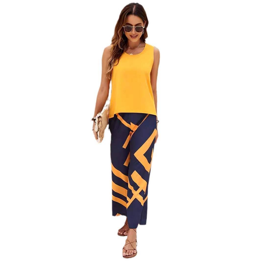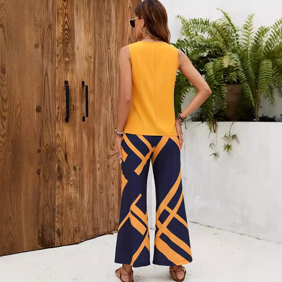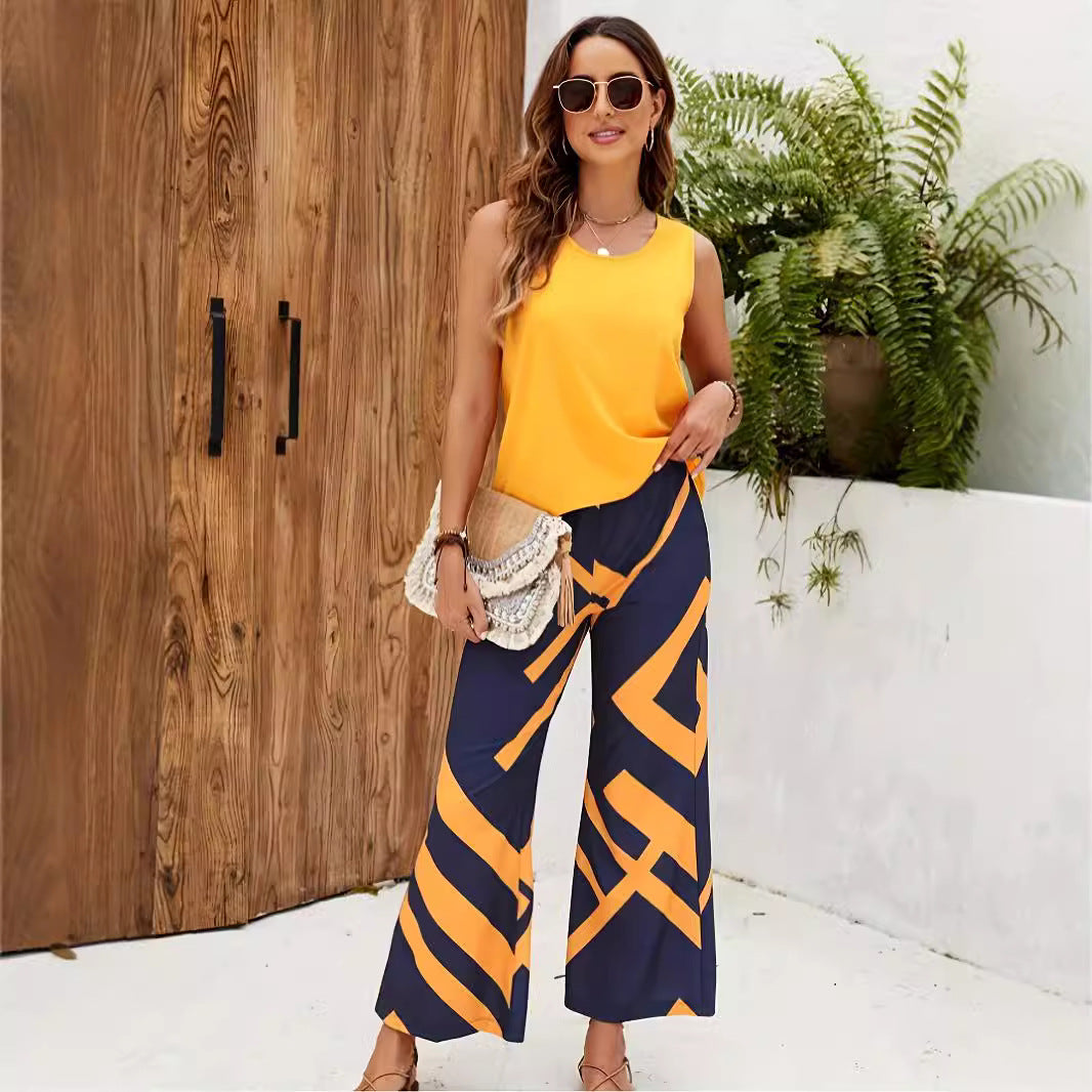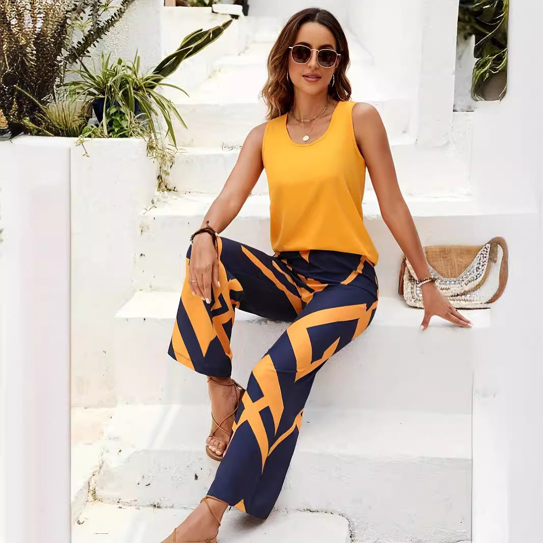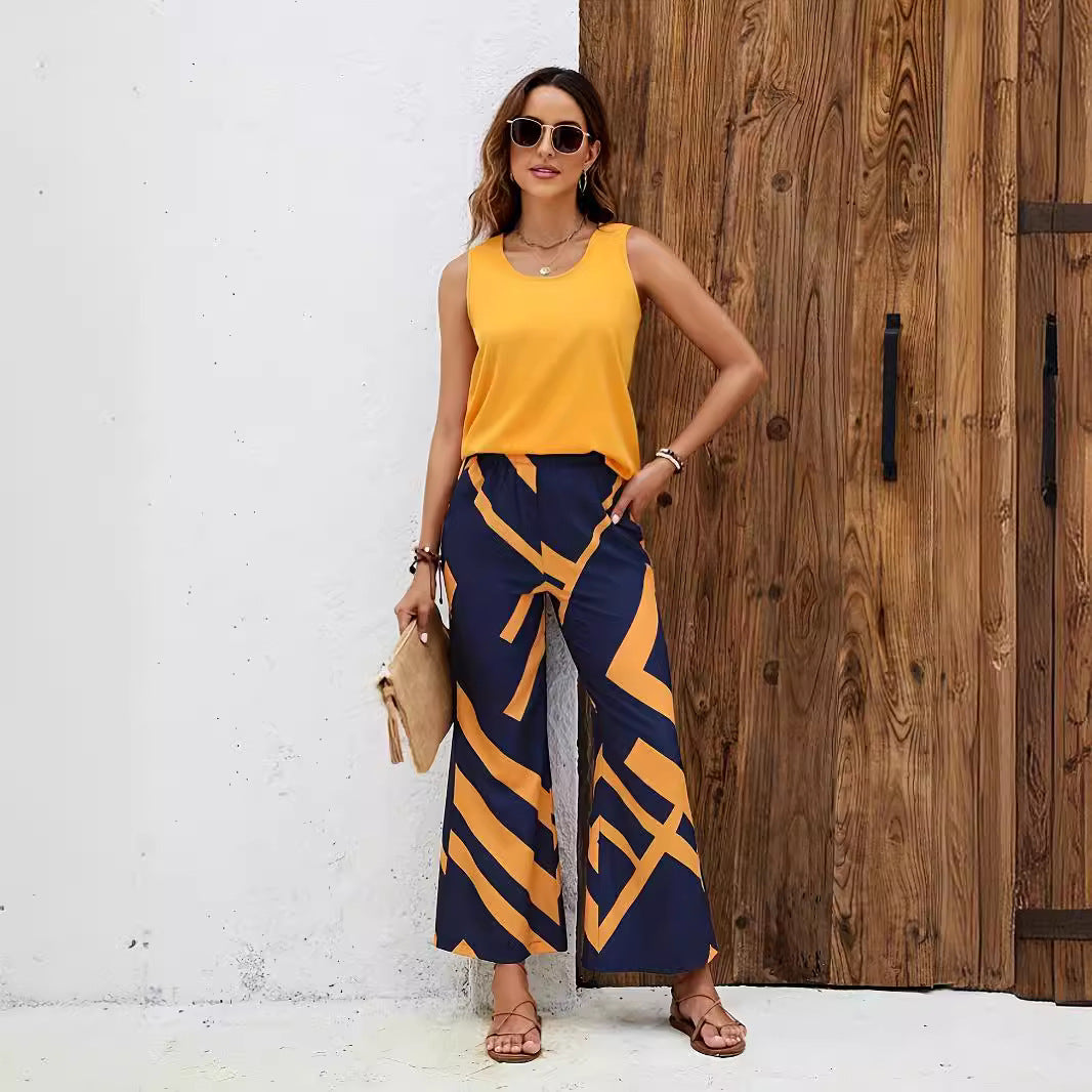 Dette damestrandoutfit fra Stilla kombinerer afslappet chic med et moderne design. Det består af en ærmeløs top og en bred bukse, perfekt til varme dage på stranden eller i byen.