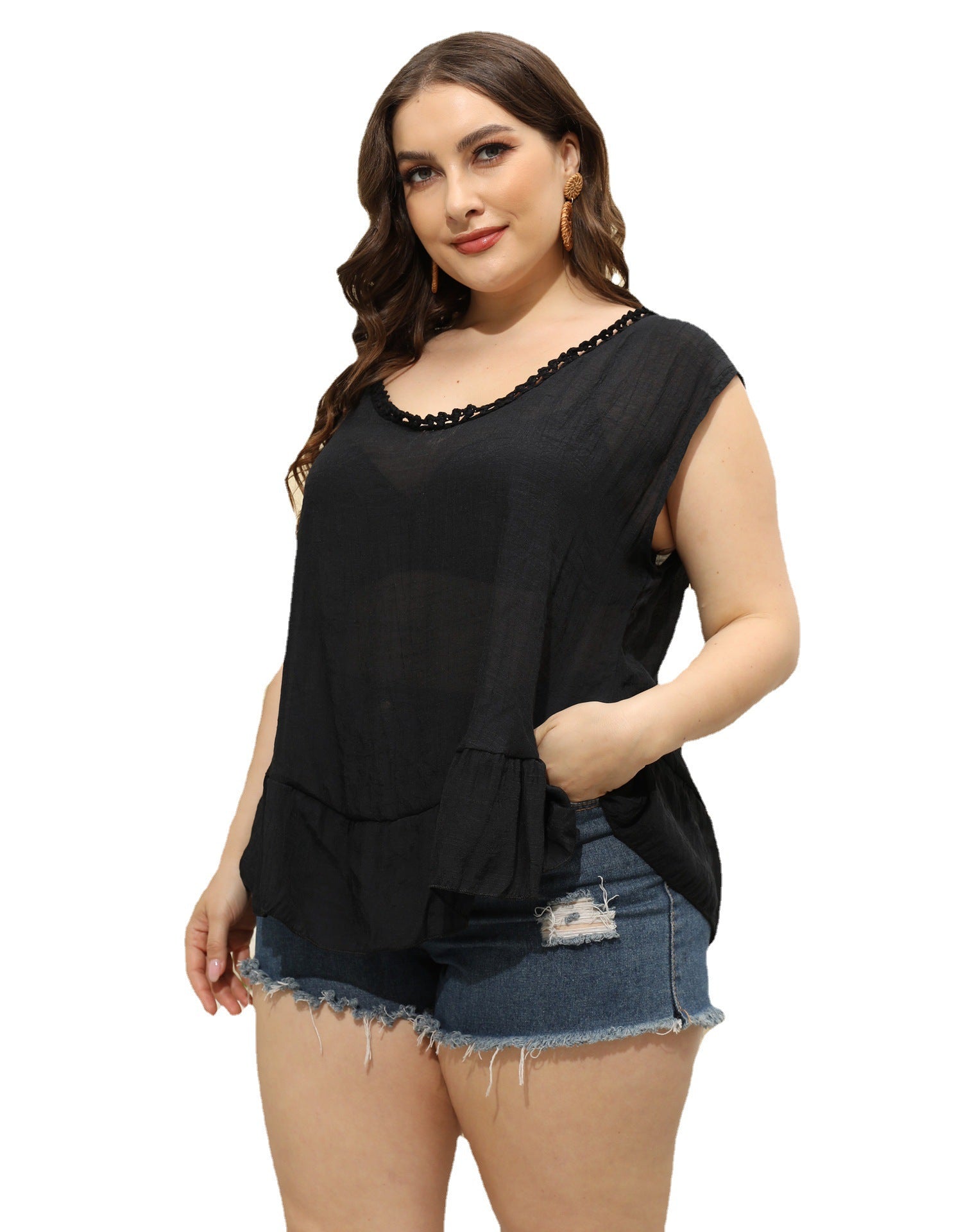Opdag vores dame afslappede strandtop, der imponerer med sin voluminøse pasform og de legende flæsedetaljer. Fremstillet af åndbare og lette materialer, er denne top perfekt til sommerdage på stranden eller i haven.