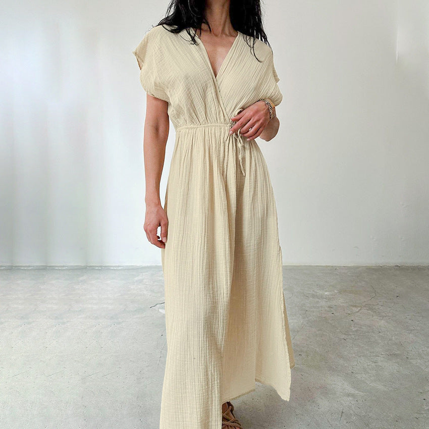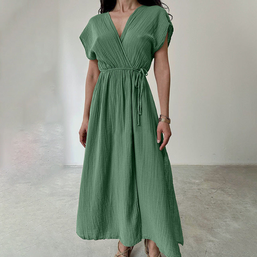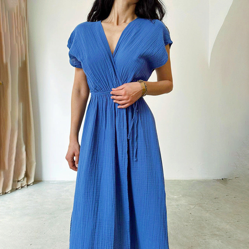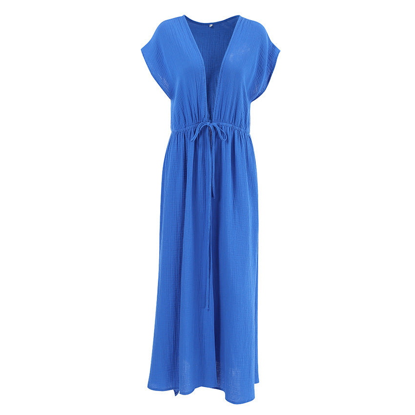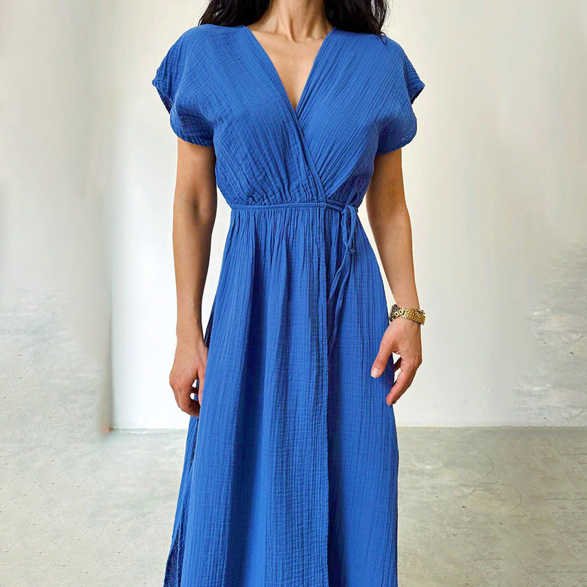Med denne kjole vil du altid føle dig godt tilpas og se fantastisk ud. Ideel til weekenden, strandbesøg eller fine arrangementer. Giv dit look et strejf af elegance med denne alsidige omslagskjole!