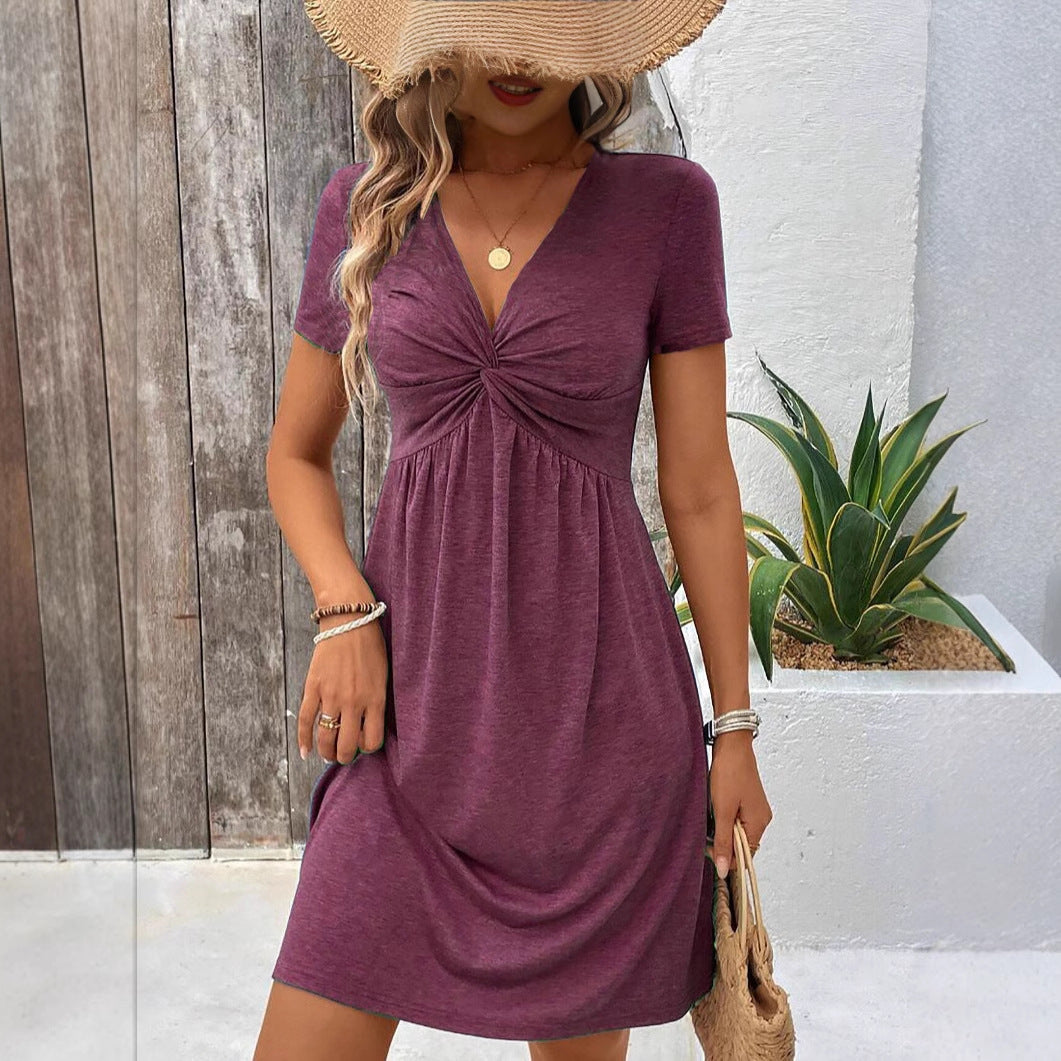 Opdag vores damers afslappede omslagskjole, der imponerer med sin elegante taljering og feminine V-hals. Denne kjole er det perfekte valg til varme sommerdage og stilfulde anledninger.