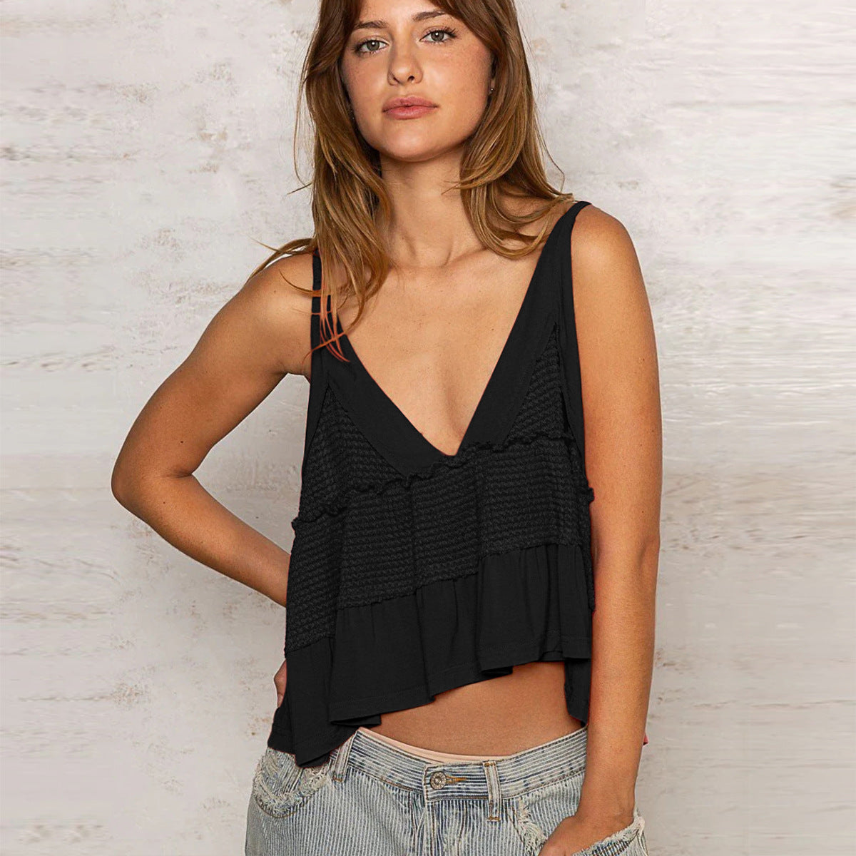 Opdag det perfekte sommerstykke med vores afslappede flæse-top, der har en moderigtig V-udskæring og justerbare spaghetti-stropper. Denne top kombinerer komfort og stil og kan ideelt kombineres med forskellige outfits.