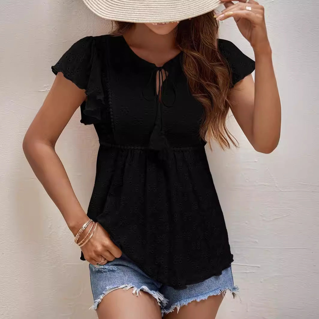 Opdag vores dametop med dekorativ nøgleudskæring og flæsedetaljer fra Stilla, der er ideel til afslappede anledninger og sommerudflugter. Denne stilfulde top tilbyder en perfekt kombination af komfort og elegance.