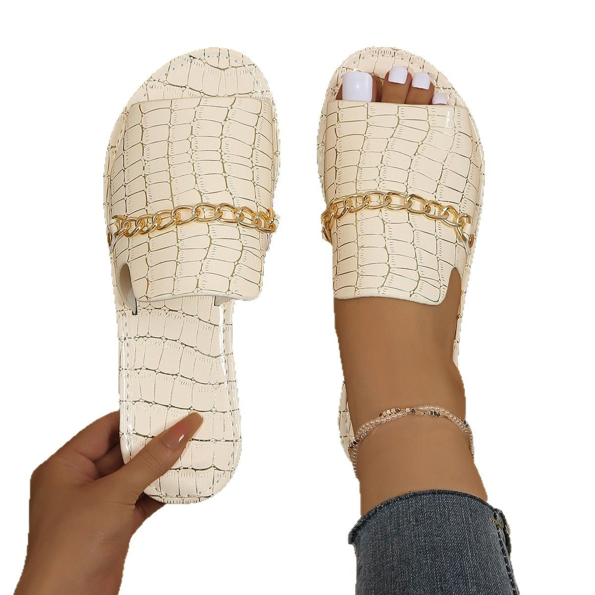 Opdag den perfekte blanding af elegance og komfort med vores åbne klip-klapper. Disse stilfulde sko er udstyret med en raffineret kædeaccent og et moderigtigt krokodilleskindsmønster, der giver et strejf af luksus.