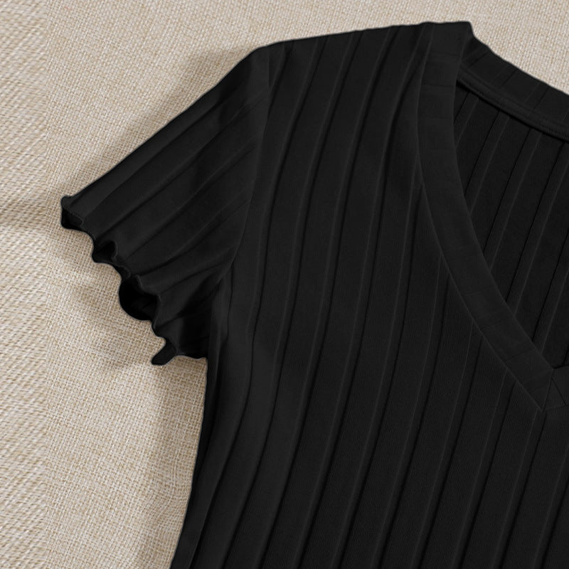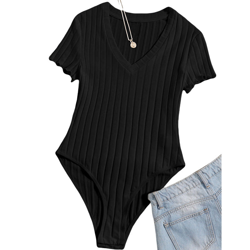 V-udskæringen smigrer dekolléten, og de korte ærmer giver en luftig pasform, der let kan kombineres med jeans eller nederdele. Den praktiske trykknaplukning i skridtet muliggør en enkel på- og aftagning.