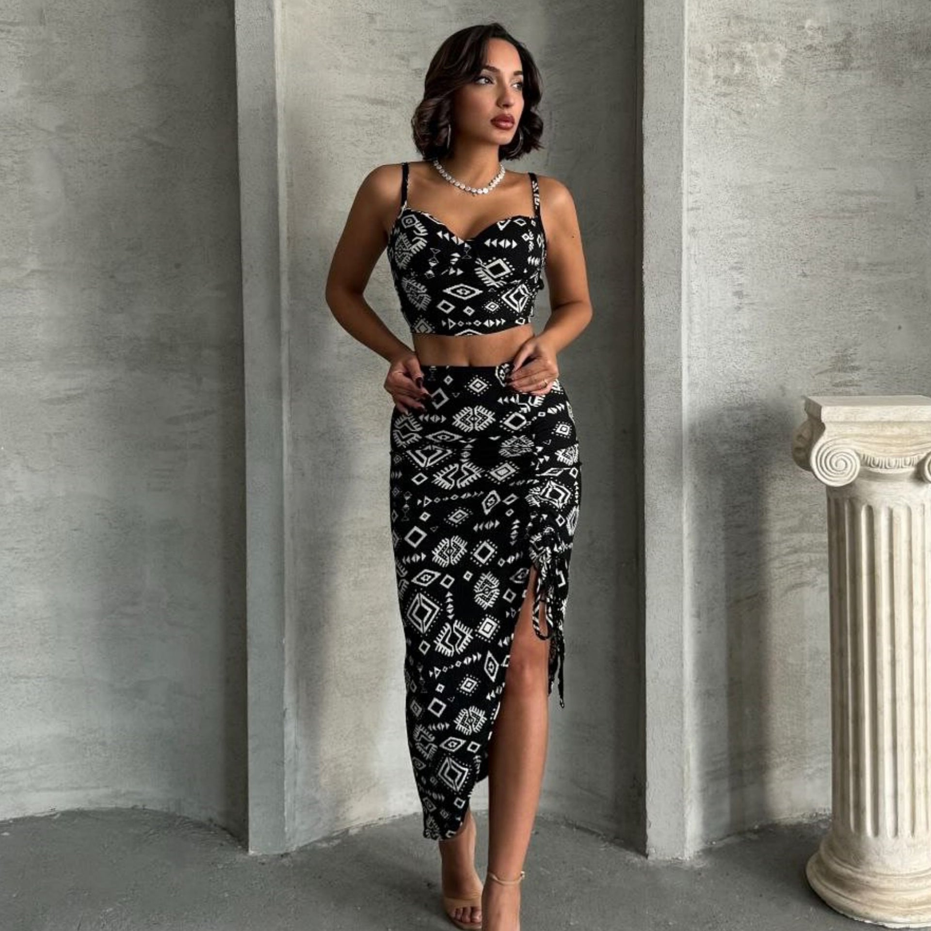 Opdag det stilfulde dametop og maxiskørt sæt med grafisk mønster fra Stilla. Dette elegante og trendy ensemble er ideelt til særlige anledninger eller afslappede sommerdage. Snittet og designet fremhæver den feminine silhuet og sikrer et modigt udseende.