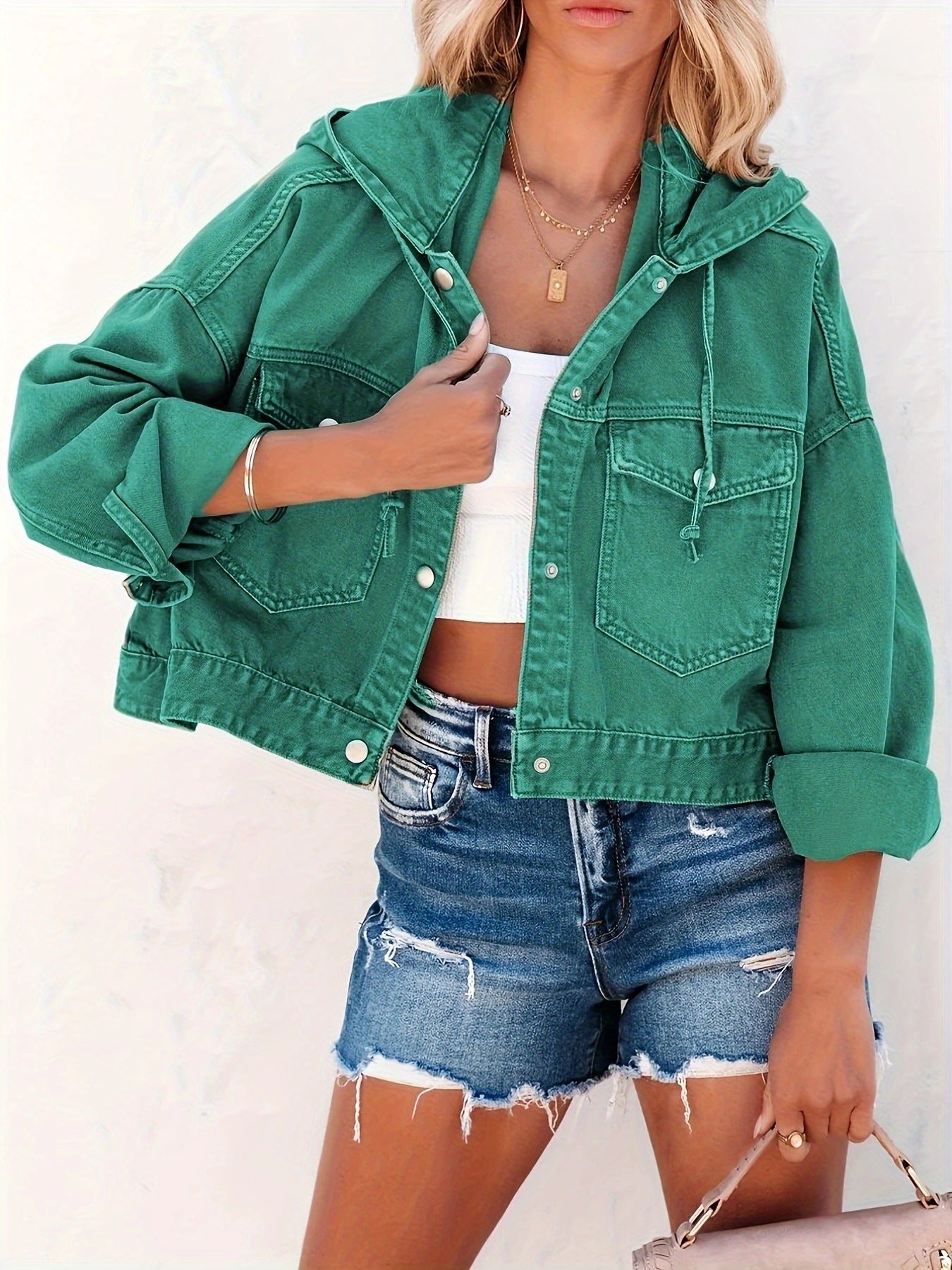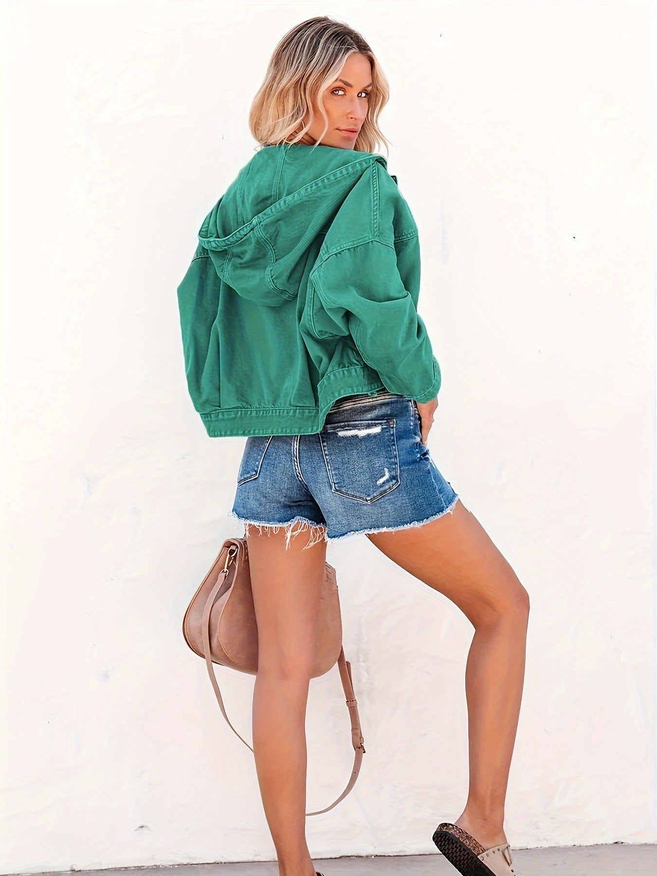 Denne stilfulde og moderne dame cropped Denimjakke kombinerer komfort med trendigt design. Fremstillet af højkvalitets denim, tilbyder den en behagelig pasform og er perfekt til ethvert fritidsoutfit. Den rummelige hætte giver jakken et afslappet look, mens de strukturerede lommer både tilbyder funktionalitet og stil.