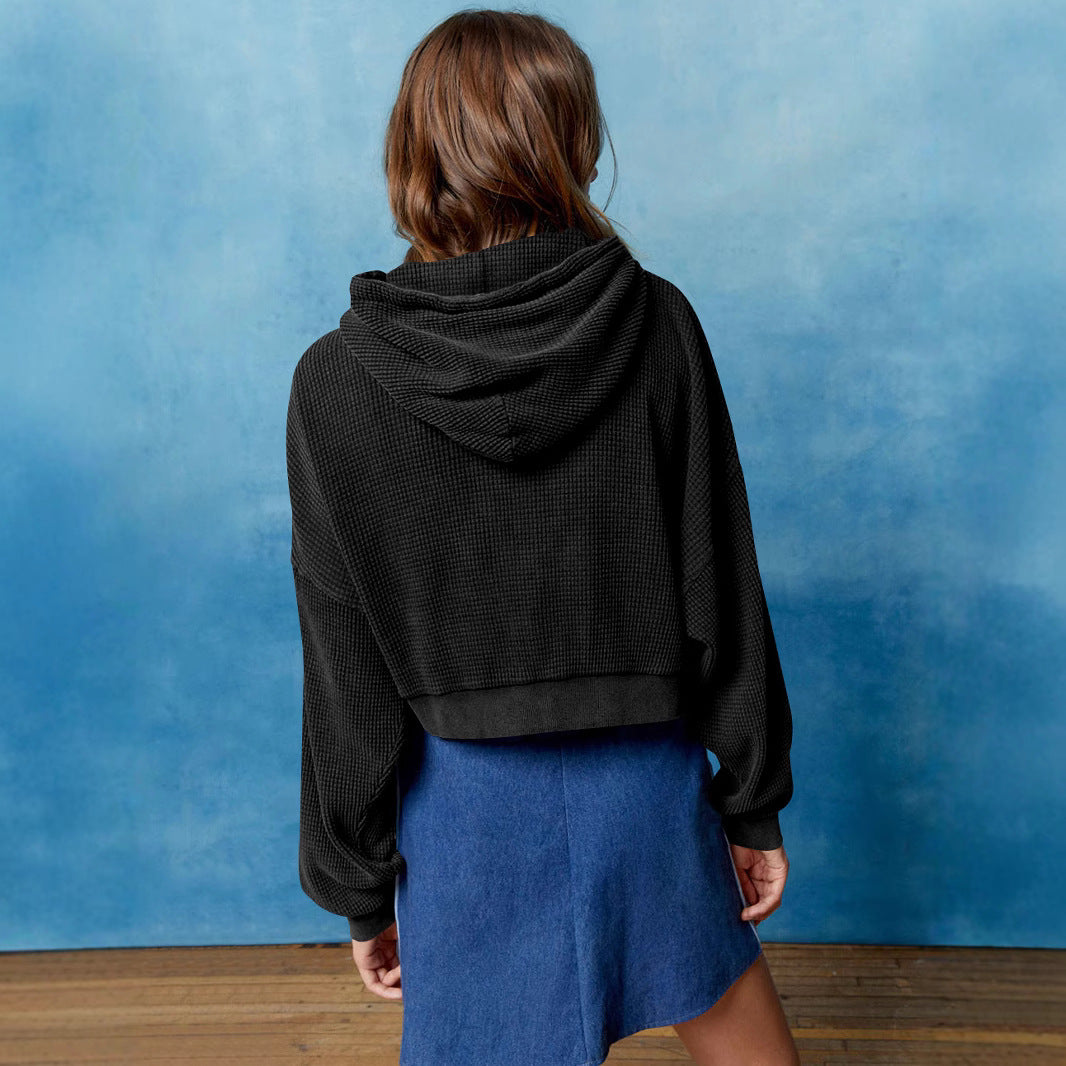 Opdag vores dames cropped hætte sweatshirt med afslappet vaffelstruktur og lynlås, der tilbyder den perfekte kombination af komfort og stil. Denne moderigtige sweatshirt er ideel til afslappede fritidsaktiviteter og kan nemt kombineres til forskellige looks.