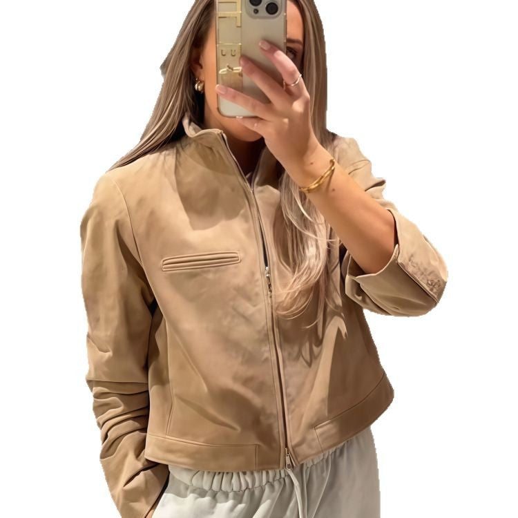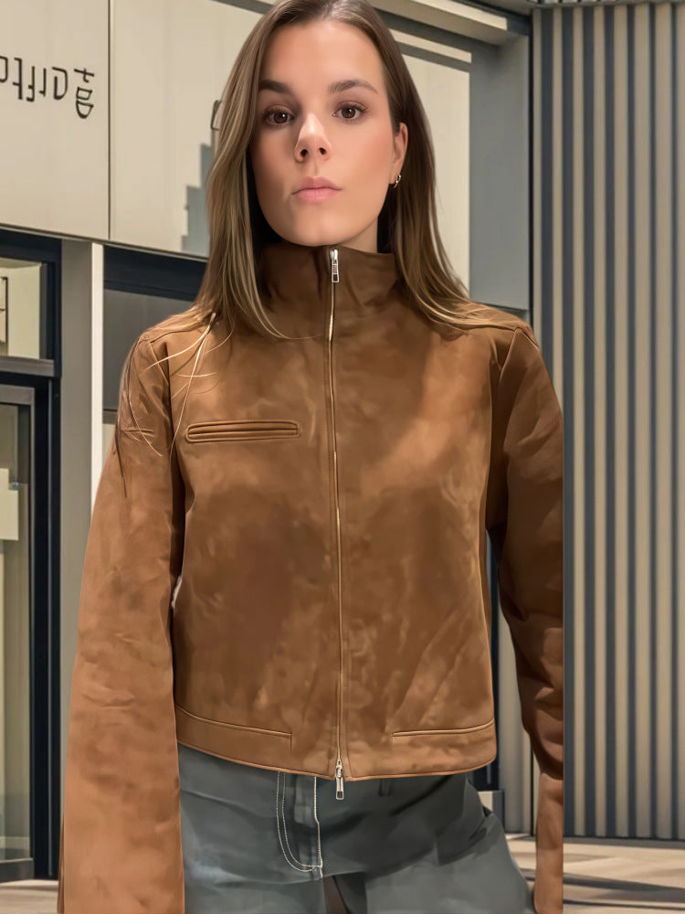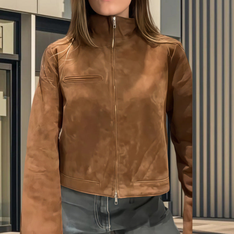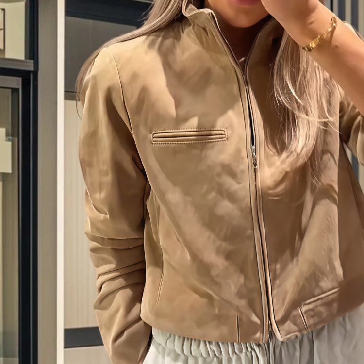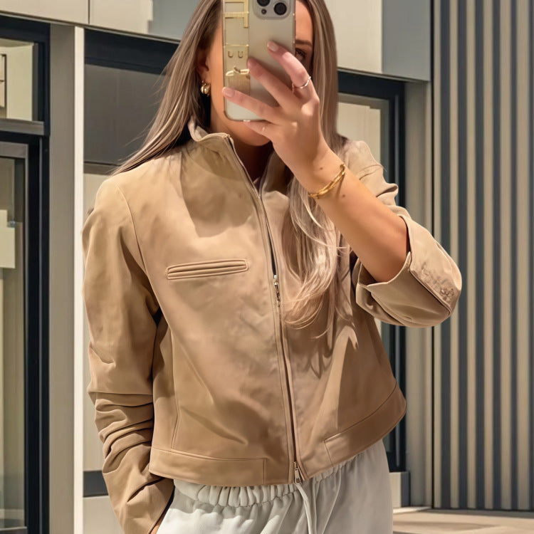 Oplev vores cropped læderjakke, der forener moderne stil og funktionalitet. Denne jakke imponerer med sin høje krave, der tilbyder optimal beskyttelse mod vinden, og en innovativ lynlås, der glider sømløst ind i designet.
