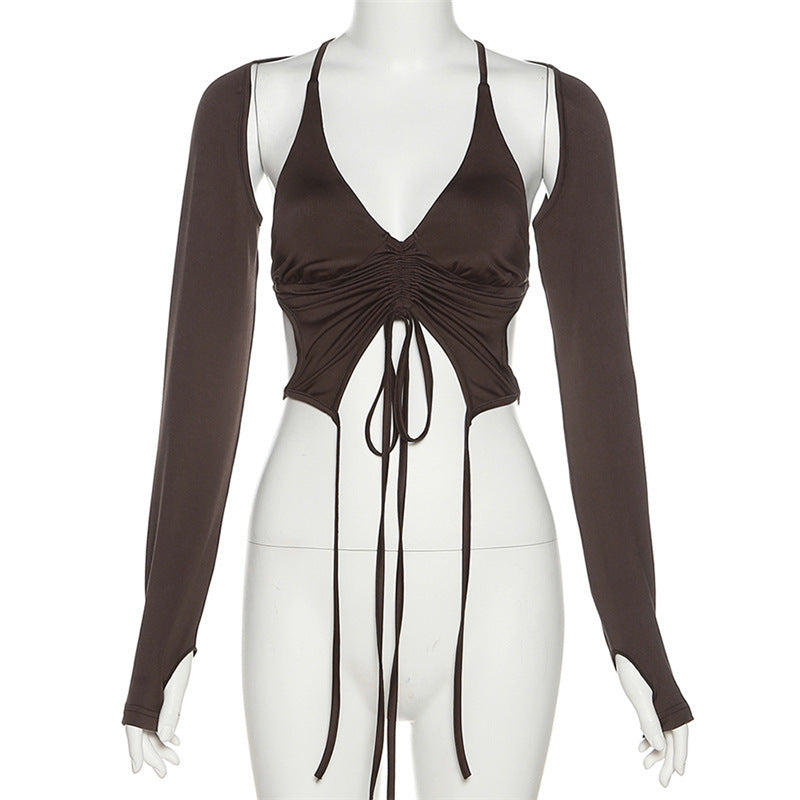 Opdag Stilla' dame cropped top med innovativt snøredesign og lange ærmer, et must-have for modebevidste kvinder, der ønsker at forene stil og komfort. Dette iøjefaldende top viser et raffineret design med en dyb udskæring og moderne rynkning, der smigrer silhuetten.