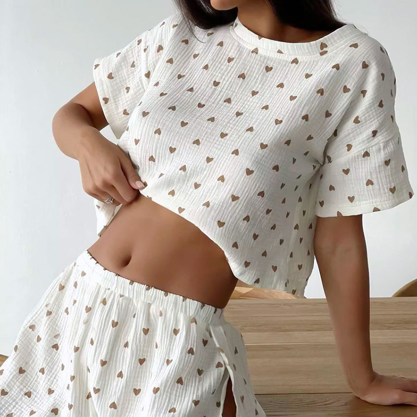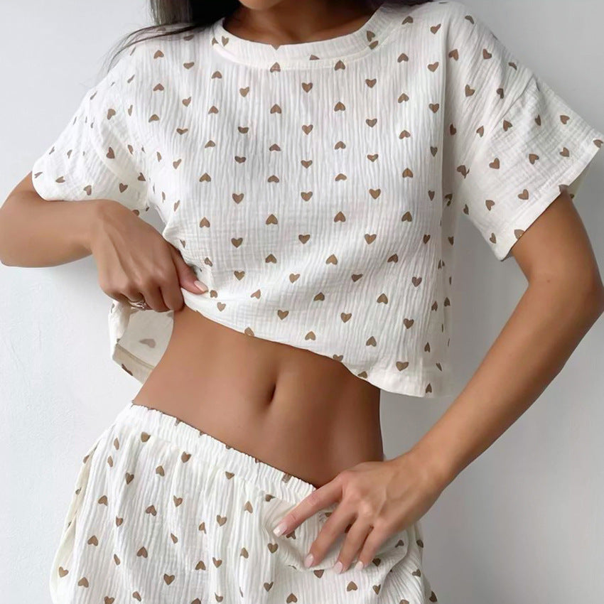 Opdag dames cropped top og shorts sæt med hjerte-design fra Stilla, perfekt til afslappede dage og hyggelige nætter. Dette sæt kombinerer stil og komfort i et unikt design, der fremhæver din feminine side.