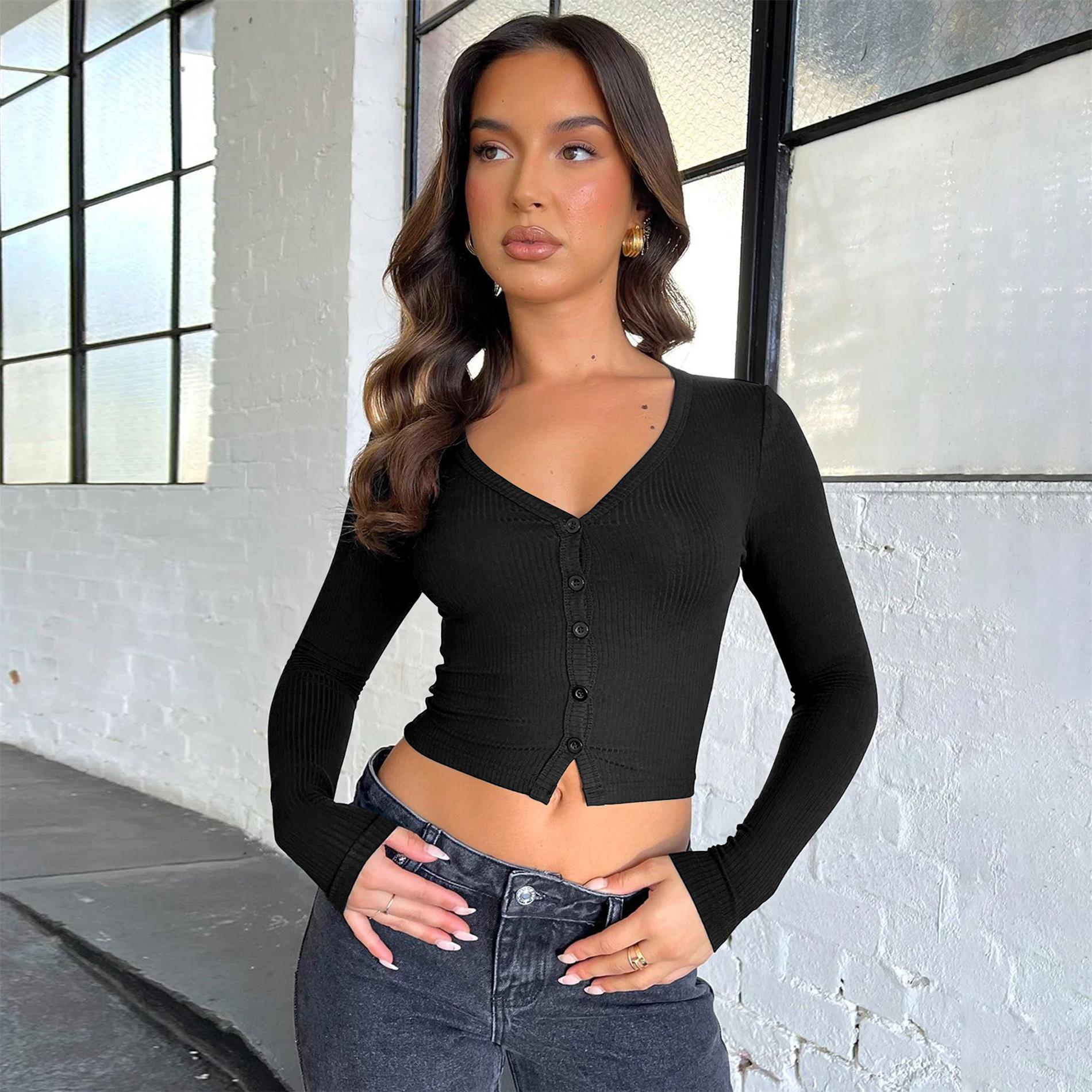 Opdag vores alsidige cropped rib top med knaplukning, perfekt til et afslappet, men elegant look. Dette top er præget af sin dybe V-hals, der fremhæver en moderne og feminin stil. Det bløde strukturerede stof sikrer en behagelig bærekomfort, mens den tætsiddende pasform smigrer din silhuet.
