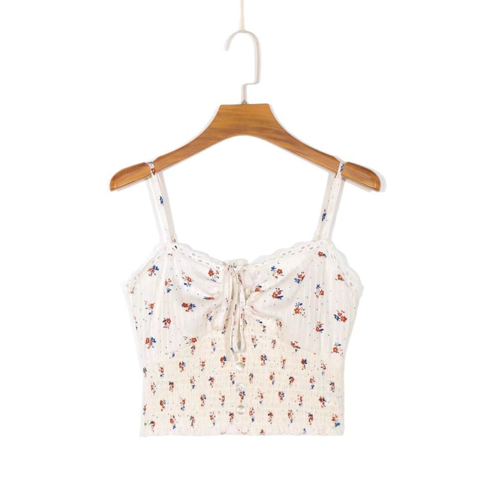 Opdag vores stilfulde og elegante dame cropped spaghetti strop top, der er prydet med et delikat blomsterdesign og raffinerede flæsedetaljer. Denne moderigtige top er perfekt til dine sommeroutfits og tilbyder både komfort og et tiltalende design.