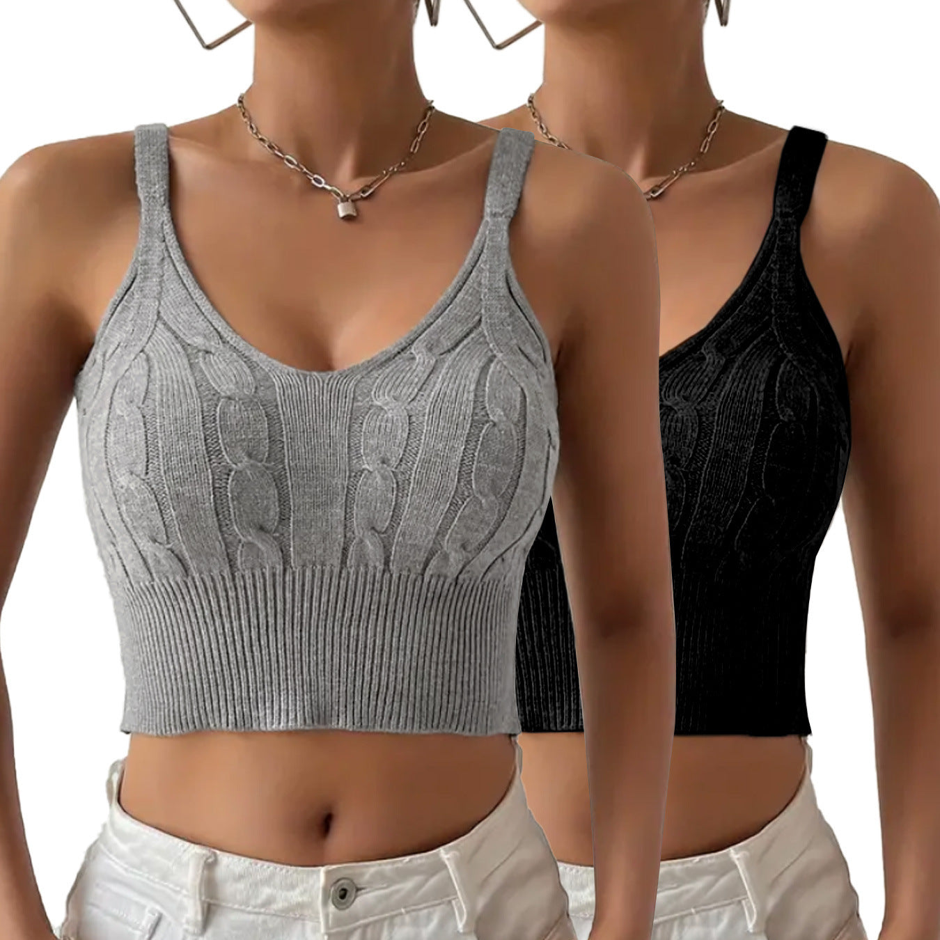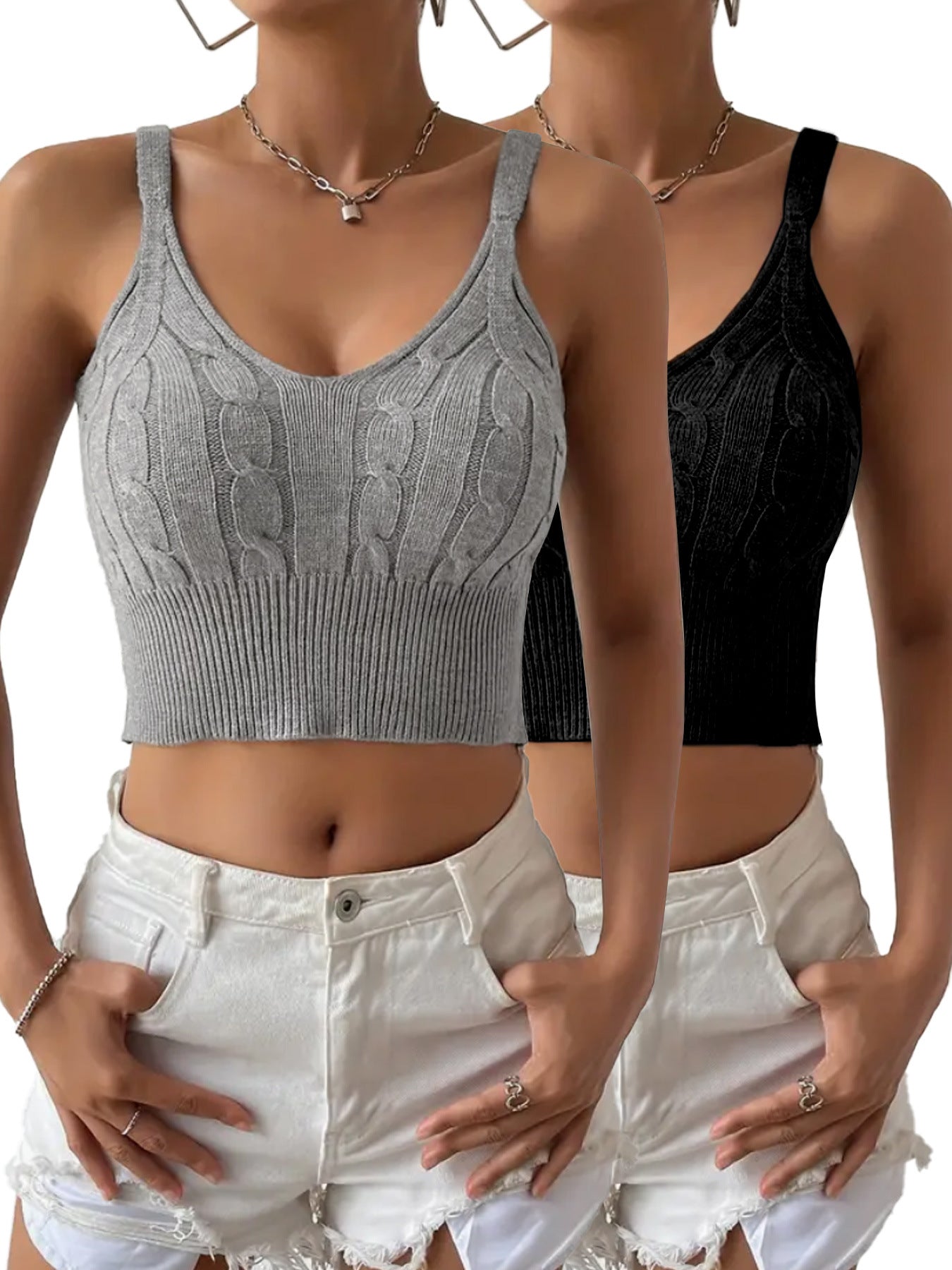 Opdag vores stilfulde, cropped strik top med dyb V-udskæring og fletmønster, der er perfekt til sommeroutfits eller afslappede anledninger. Denne top forener komfort med et moderne look.