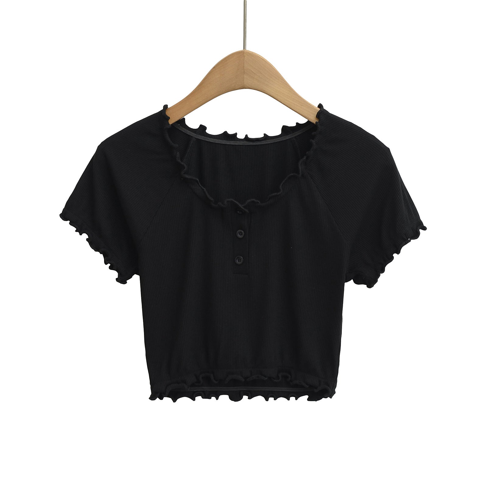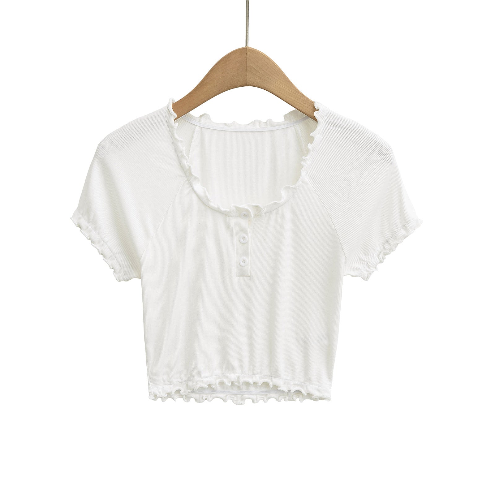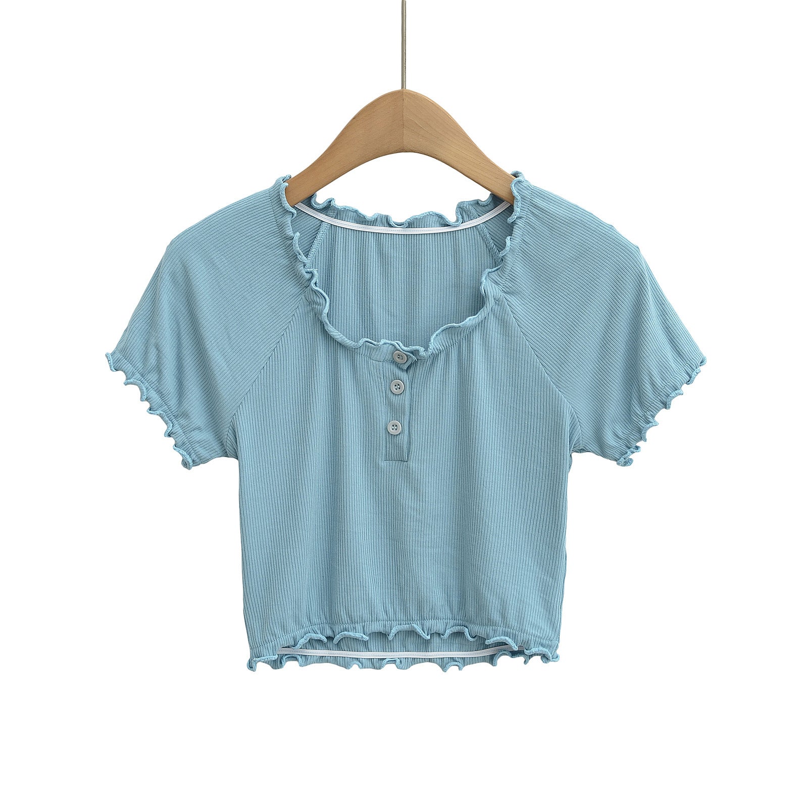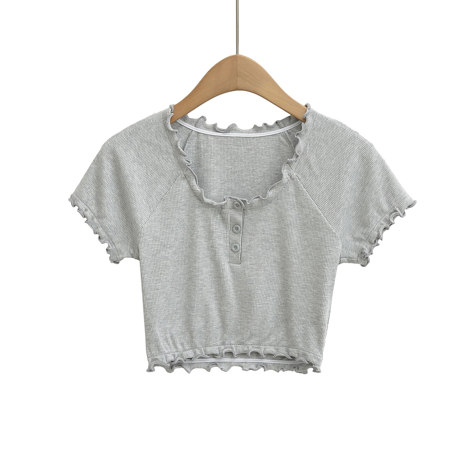 Opdag vores stilfulde cropped T-shirt med legende flæsedetaljer og en charmerende knaplukning. Dette overtøj kombinerer komfort med et moderne look, ideelt til afslappede og elegante outfits.