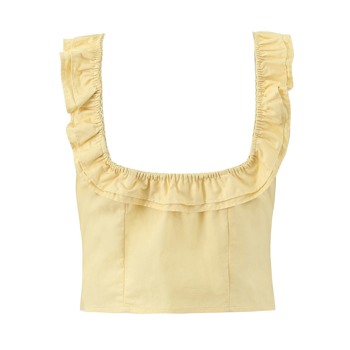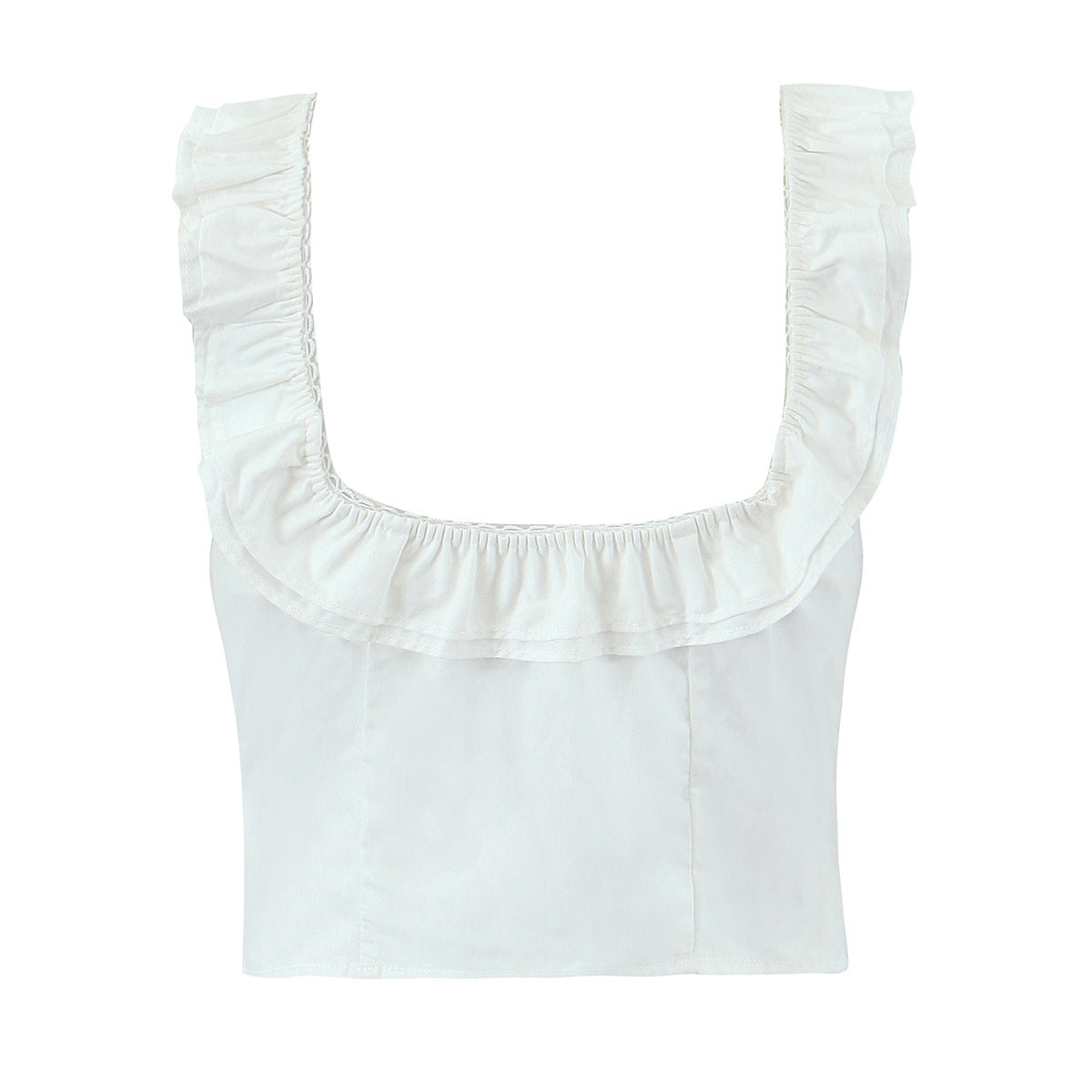 Dette elegante dame cropped top er det perfekte must-have for enhver modebevidst kvinde, der ønsker at kombinere stil og komfort. Med en charmerende flæsekant og dekorative knaplukninger tilbyder det ikke kun et stilfuldt look, men også en fremragende pasform.