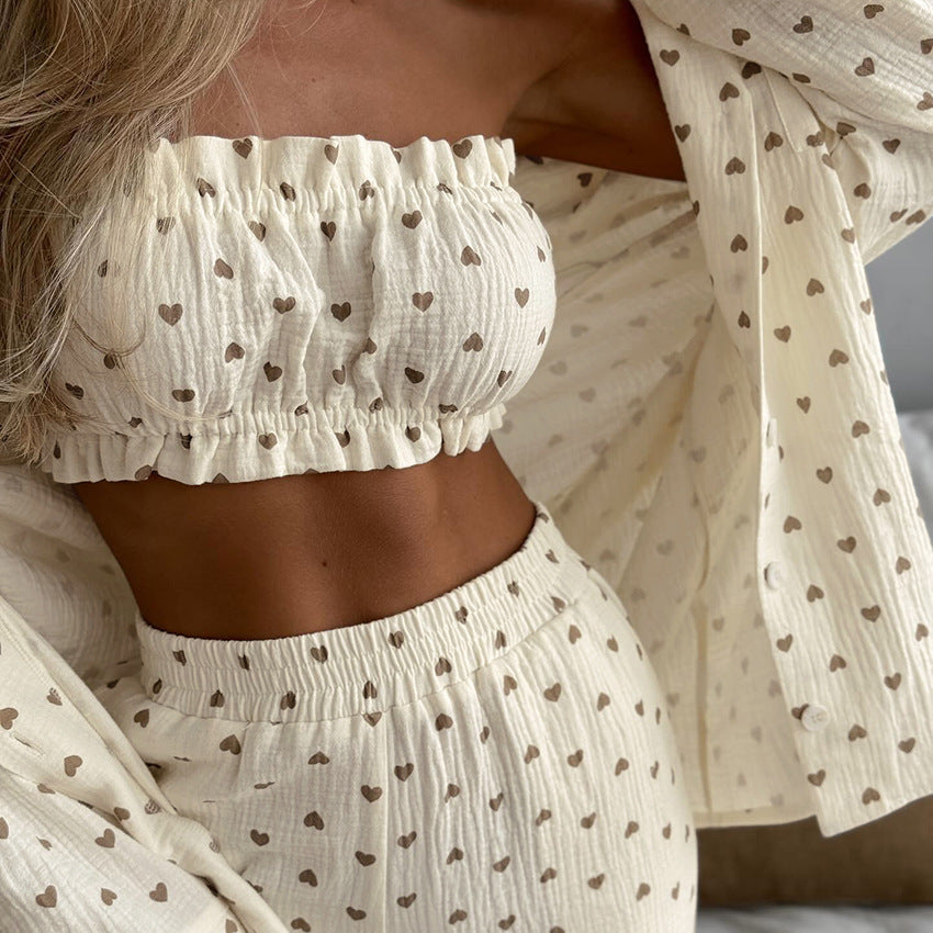 Dette vidunderlige dames cropped top og nederdel sæt med hjerte motiv fra Stilla kombinerer stil og komfort perfekt. Sættet er ideelt til varme sommerdage og er fremragende til afslappede udflugter eller uformelle anledninger.