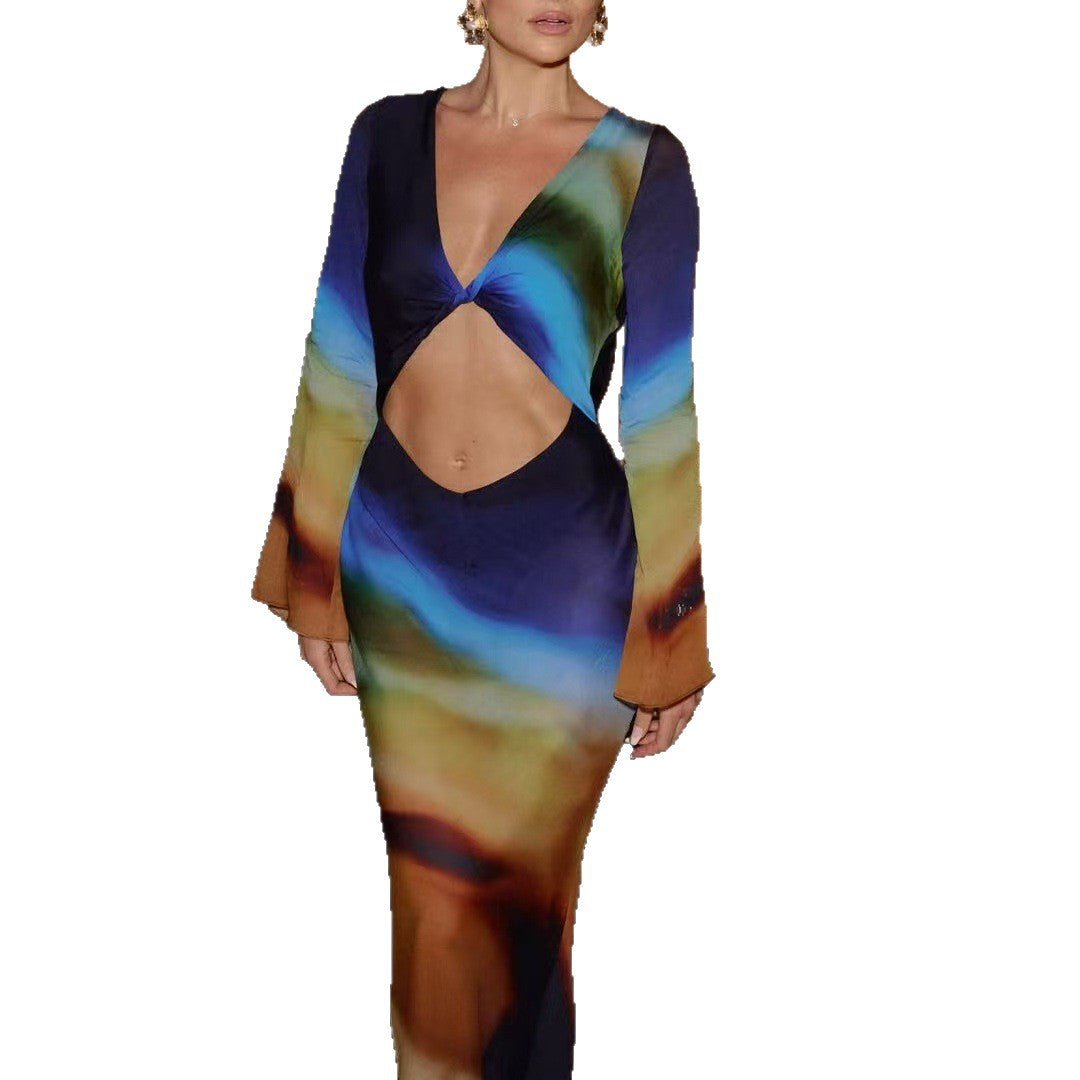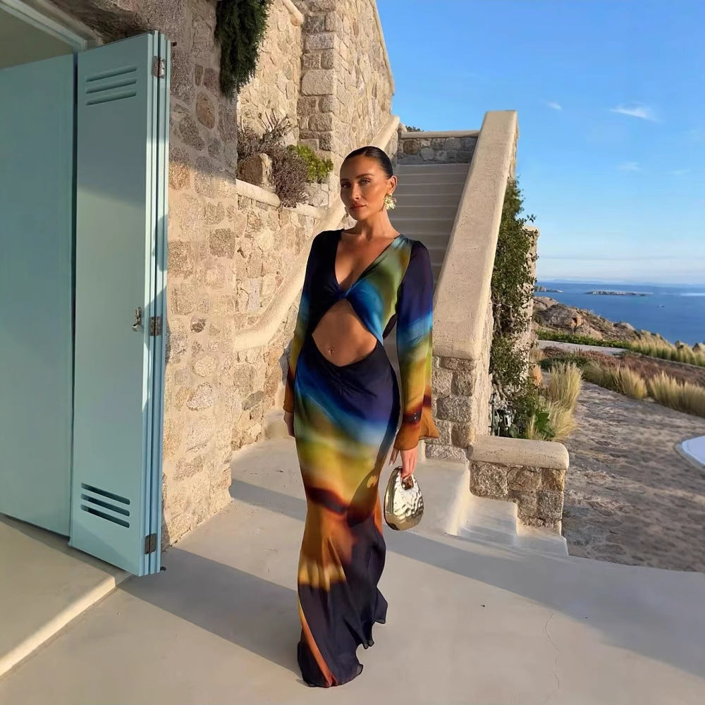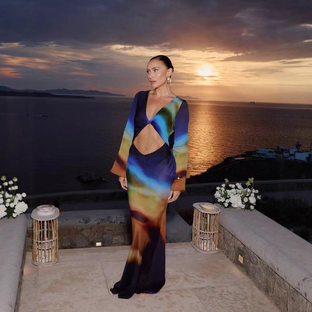 Oplev den perfekte blanding af stil og komfort med vores dames Cut-Out Maxikjole. Denne kjole er et fremragende valg til særlige begivenheder og sociale events. Det kreative Cut-Out område under brystet giver et spændende look, mens de lange, vide ærmer tilføjer en elegant note til designet.