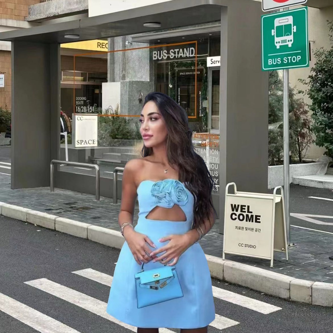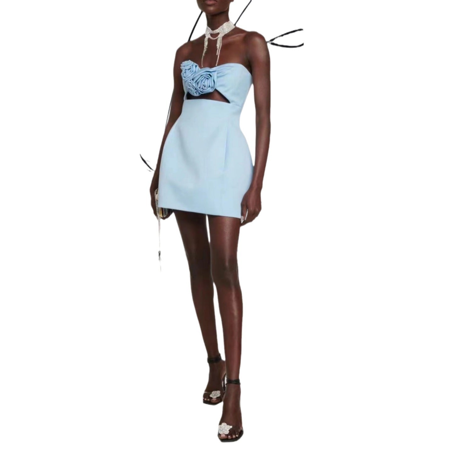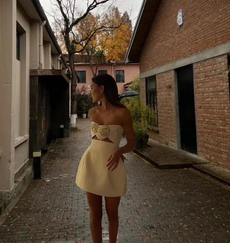 Denne vidunderlige Cut-Out minikjole til damer kombinerer moderne elegance med legende charme. Den præsenterer sig med en yndig floral applikation, der kunstnerisk fremhæver dekolletagen.