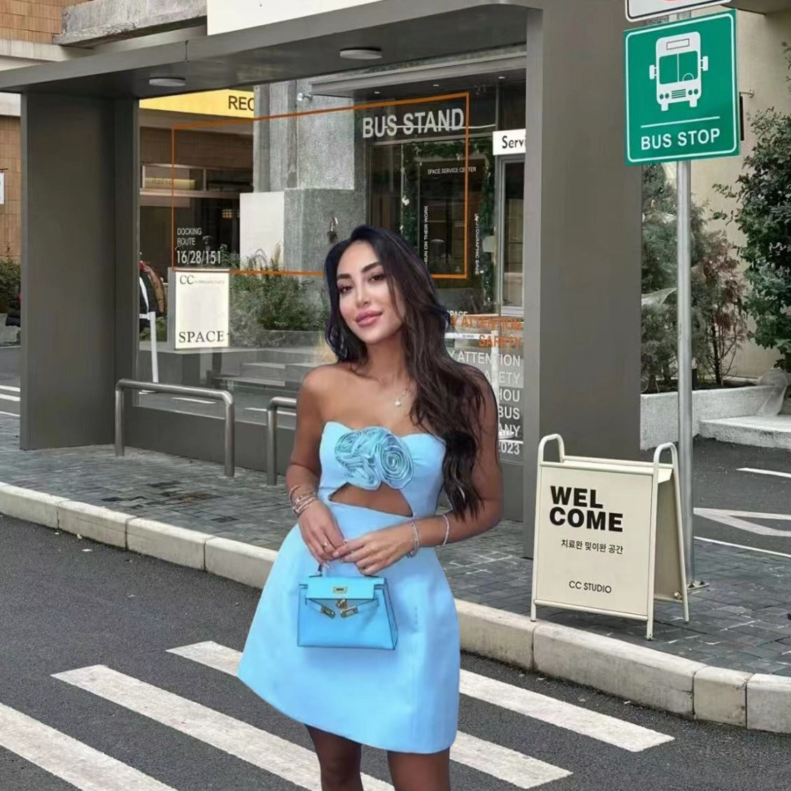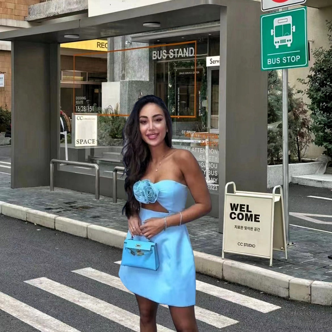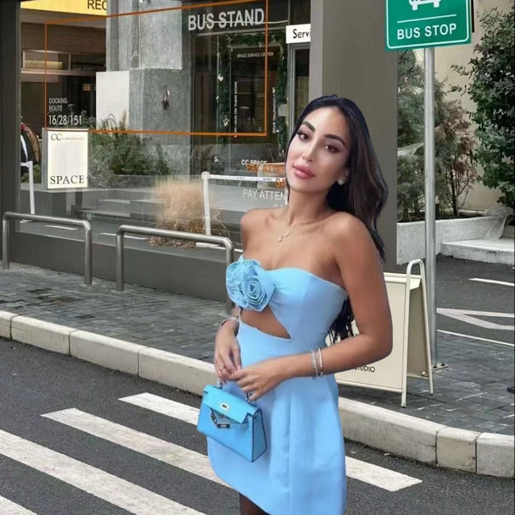 Denne vidunderlige Cut-Out minikjole til damer kombinerer moderne elegance med legende charme. Den præsenterer sig med en yndig floral applikation, der kunstnerisk fremhæver dekolletagen.