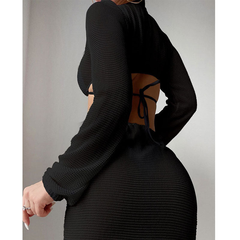 Denne trendy Cut-Out minikjole er et stilfuldt must-have for enhver fashionista. Med sit unikke design og kombinationen af lange ærmer og en forførende udskæring tilbyder den både eleganse og et strejf af raffinement.