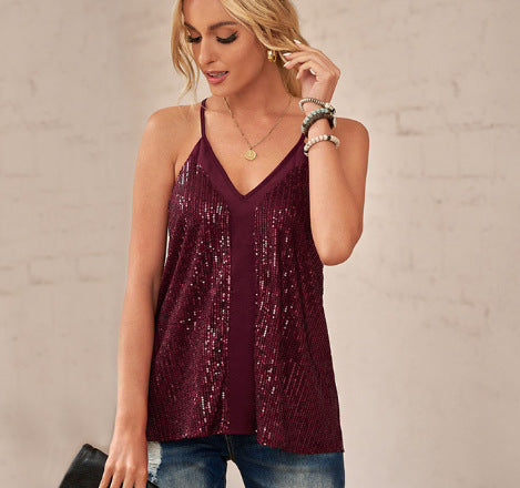 Opdag vores elegante dames top, der er prydet med skinnende glitrende detaljer. Dette moderigtige top imponerer med sin behagelige pasform og de fine spaghetti-stropper, der fremhæver skuldrene perfekt. Ideel til festlige anledninger eller en aften med venner, tilbyder toppen både komfort og stil.
