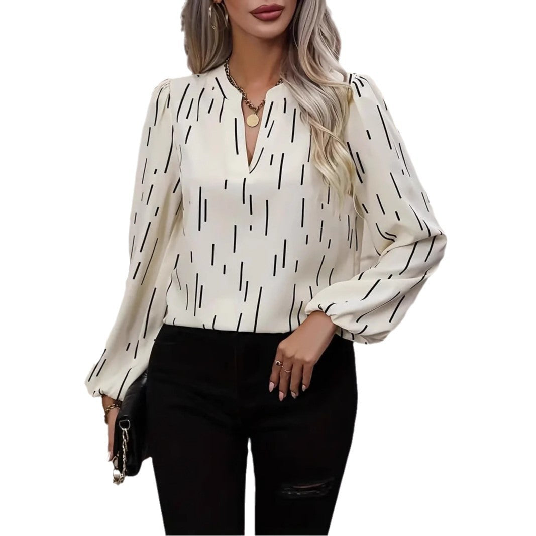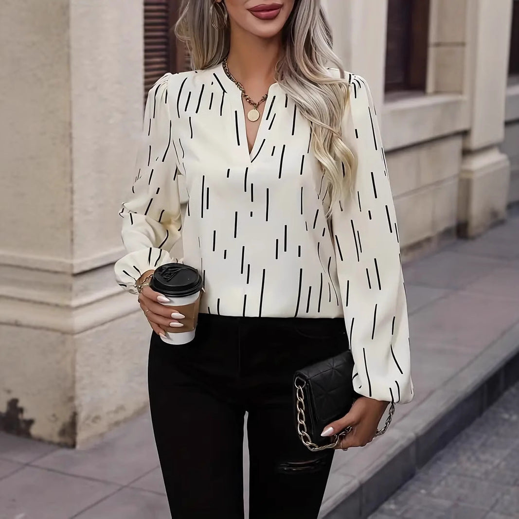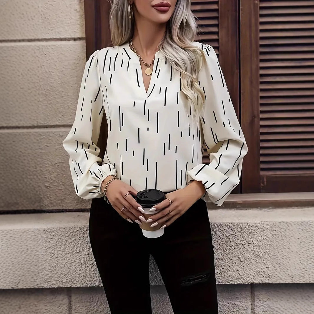 Opdag den stilfulde damestribede bluse med V-udskæring og ballonformede ærmer fra Stilla. Denne elegante bluse kombinerer komfort og moderne design, ideel til forskellige anledninger.