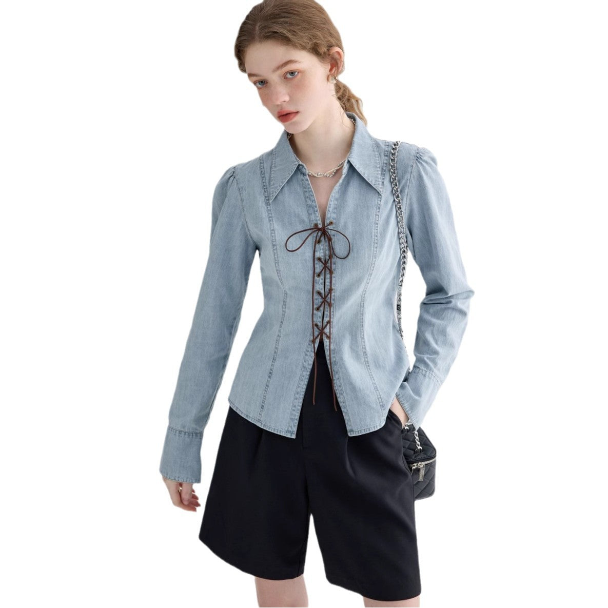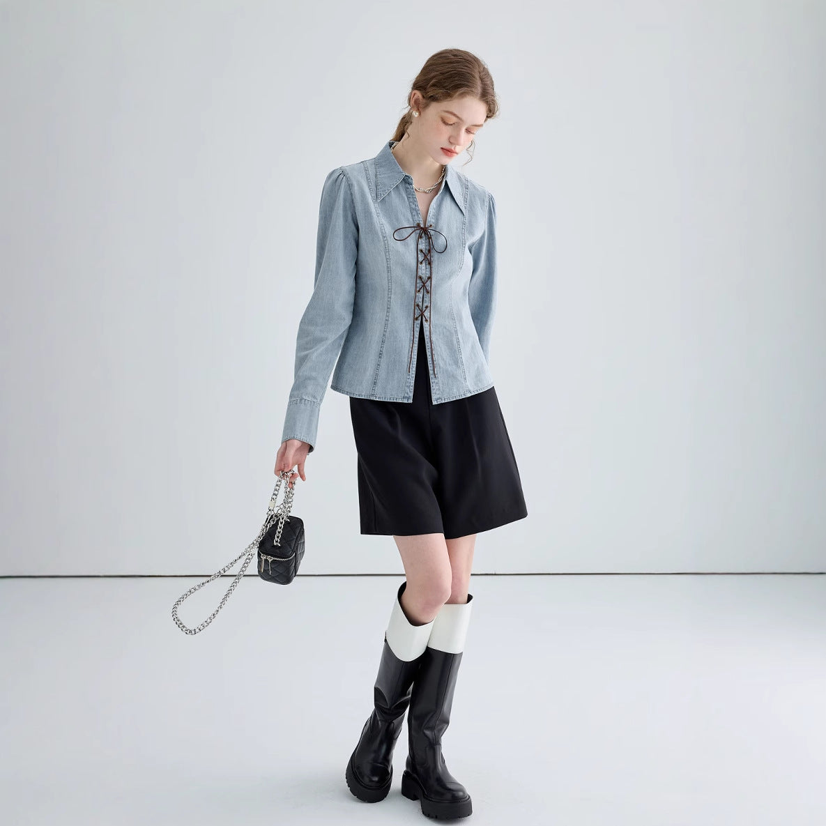 Oplev den perfekte kombination af stil og komfort med vores dame denimskjorte. Dette unikke tøjstykke er kendetegnet ved et historisk snøredetalje, der virker både moderne og tidløst.