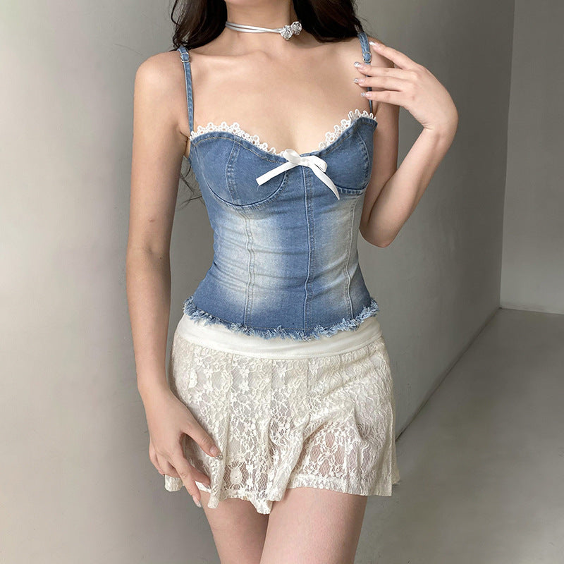 Opdag vores dames Denim-crop-top med udsøgte blonde detaljer og et raffineret kantdesign. Dette unikke top kombinerer afslappet denimstil med feminine detaljer og er perfekt til forskellige lejligheder.