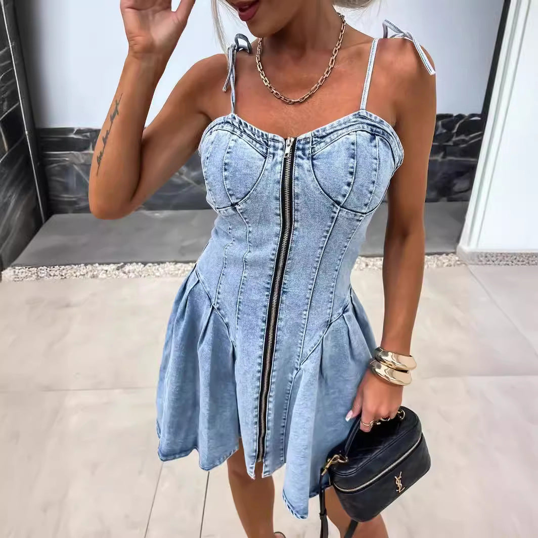 Opdag vores unikke dames denim kjole i korset-stil, som perfekt forener elegance og komfort. Denne kjole er ideel til forskellige anledninger, hvad enten det er til en dag udendørs eller en aftenbegivenhed.