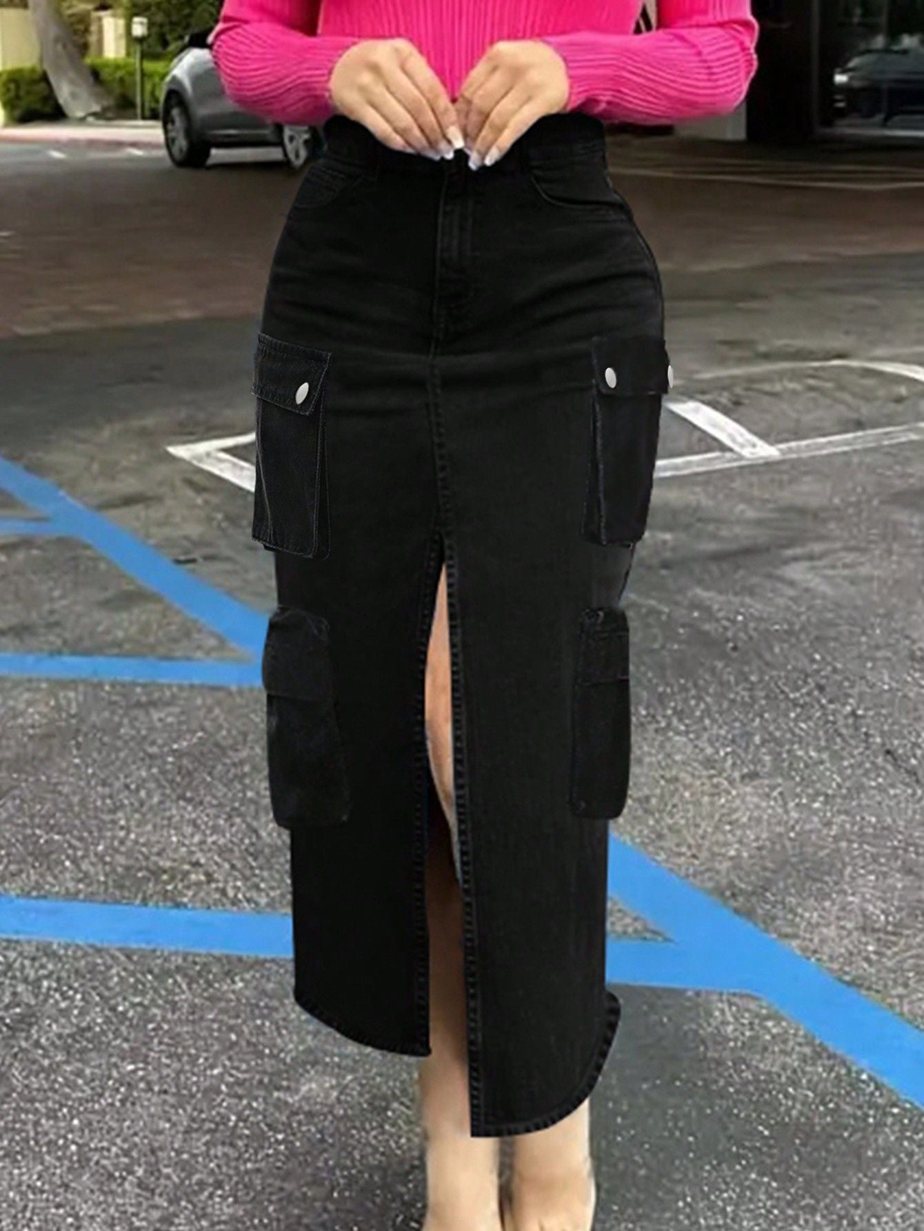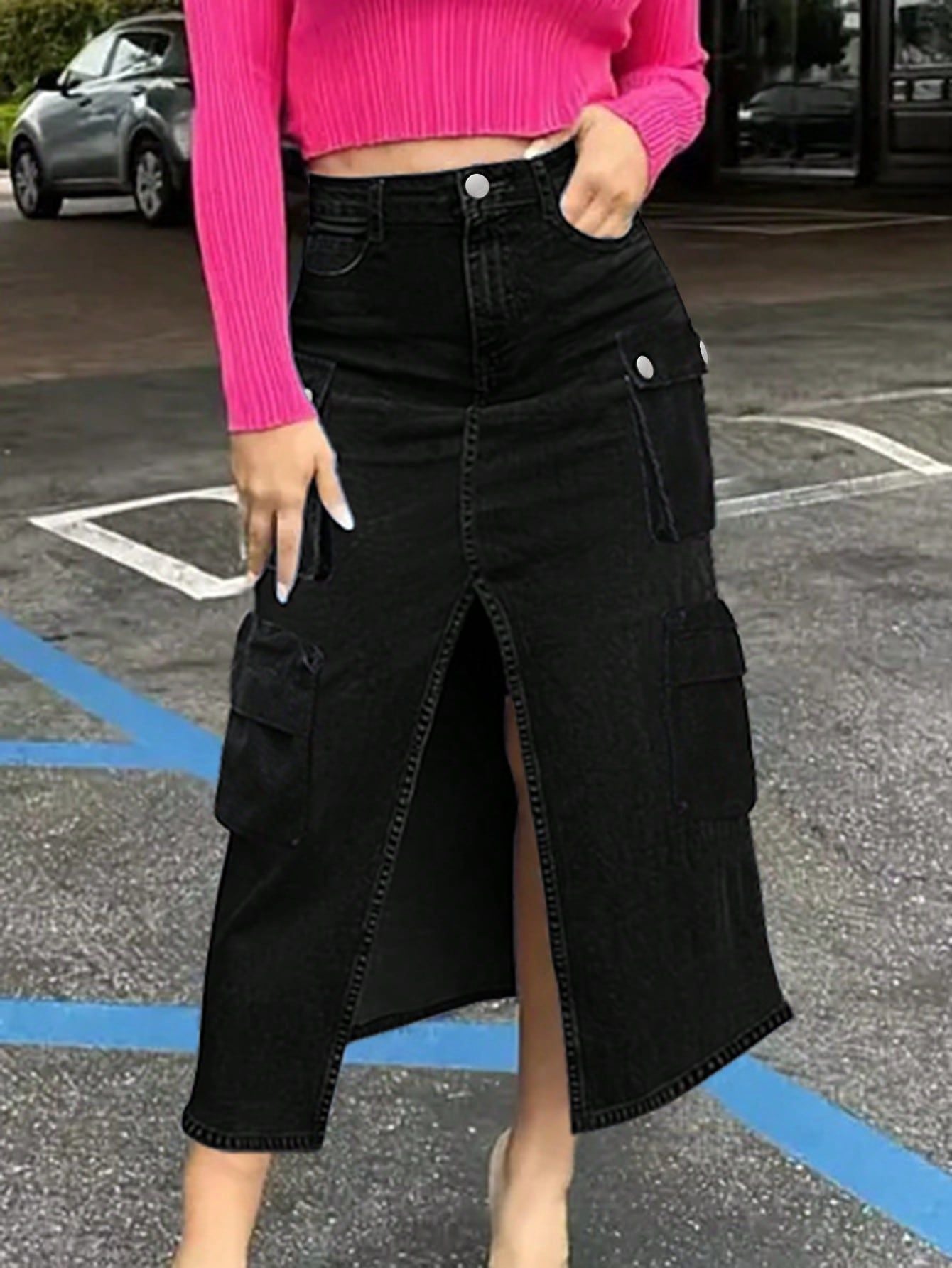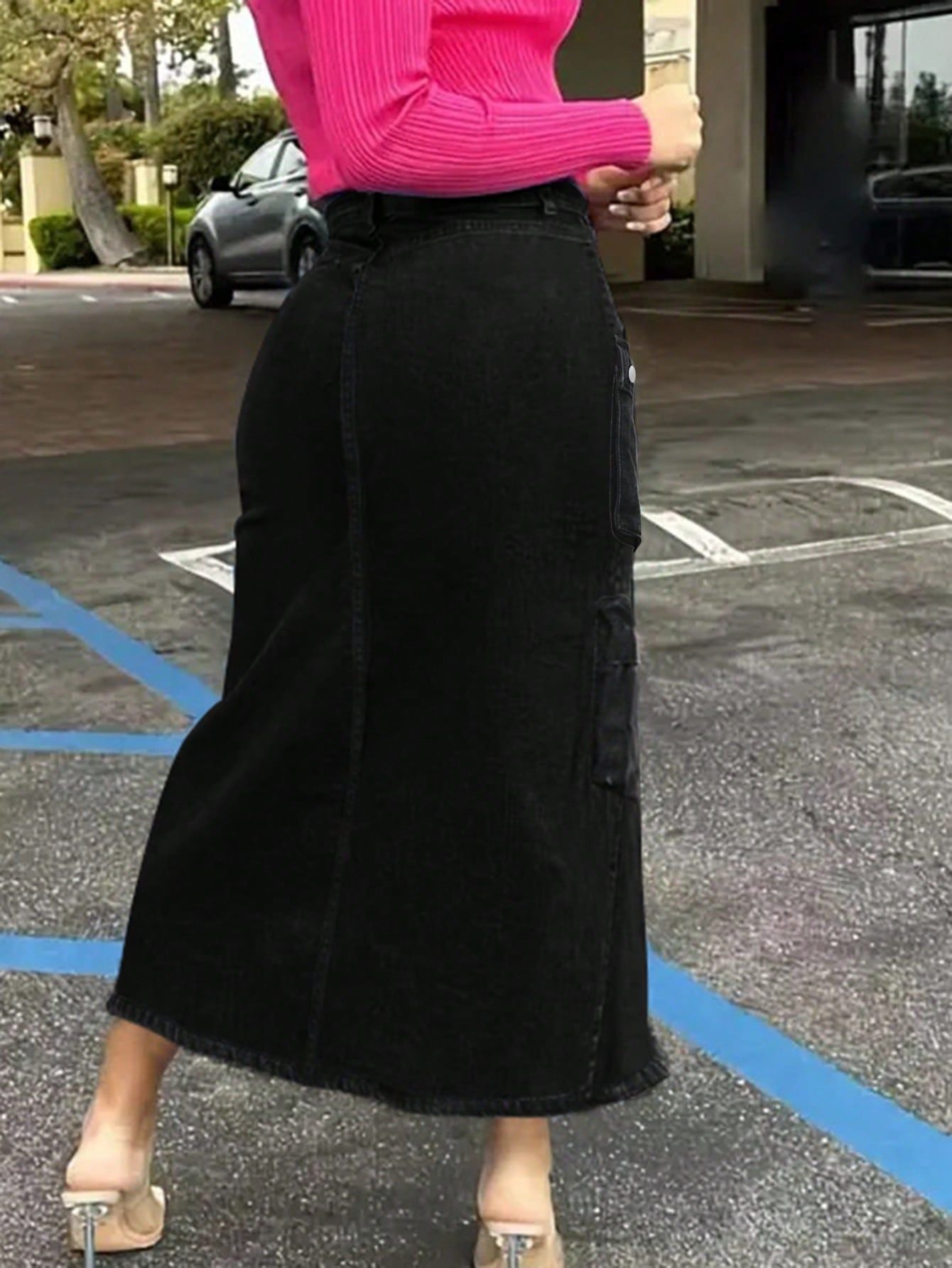 Opdag vores dame denim midi-nederdel med praktiske cargo-lommer og slidsbetont design. Denne stilfulde nederdel kombinerer komfort og funktionalitet, ideel til moderne kvinder, der ønsker at fremstå både modebevidste og praktiske.