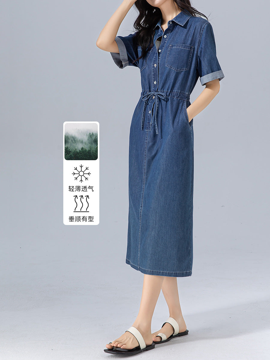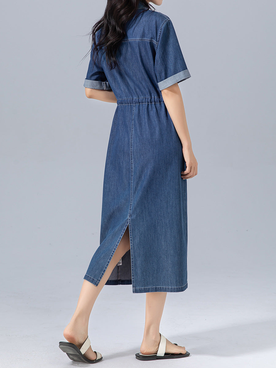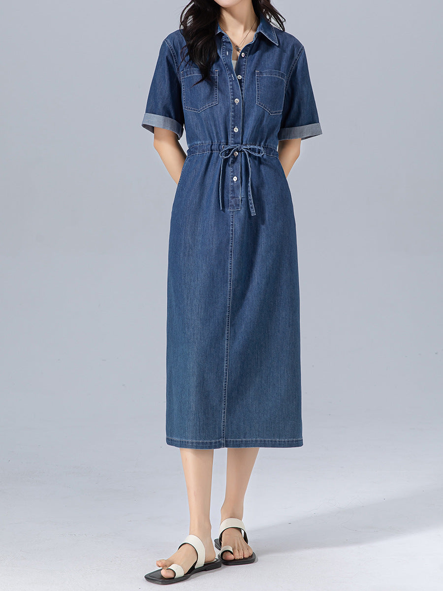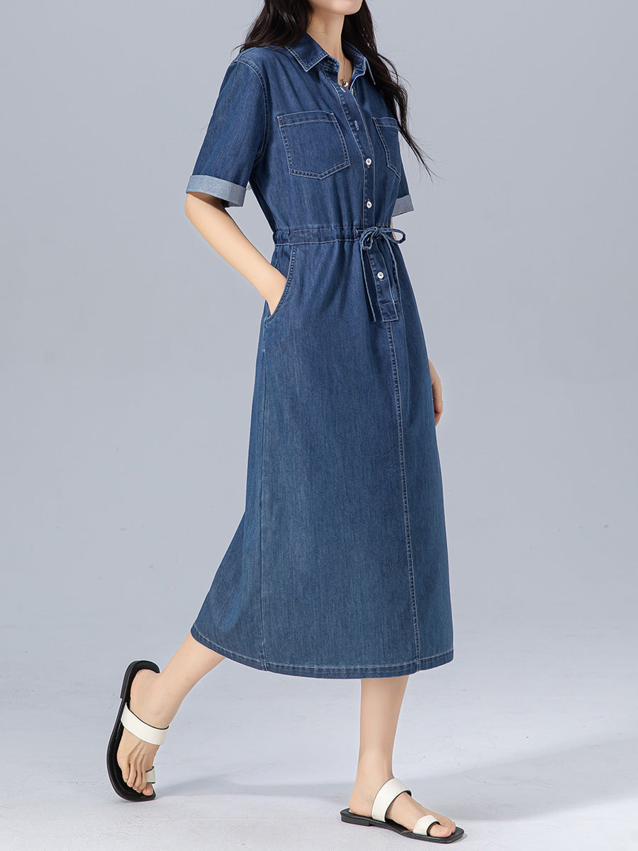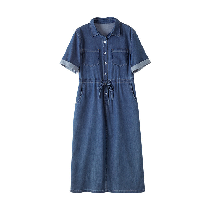 Vores dames denim skjortekjole kombinerer stil med funktionalitet og er ideel til hverdagsbrug såvel som til særlige anledninger. Kjolen tilbyder en figursyet pasform, der smukt fremhæver din silhuet, og den er lavet af højkvalitets denim for at sikre både holdbarhed og bærekomfort.