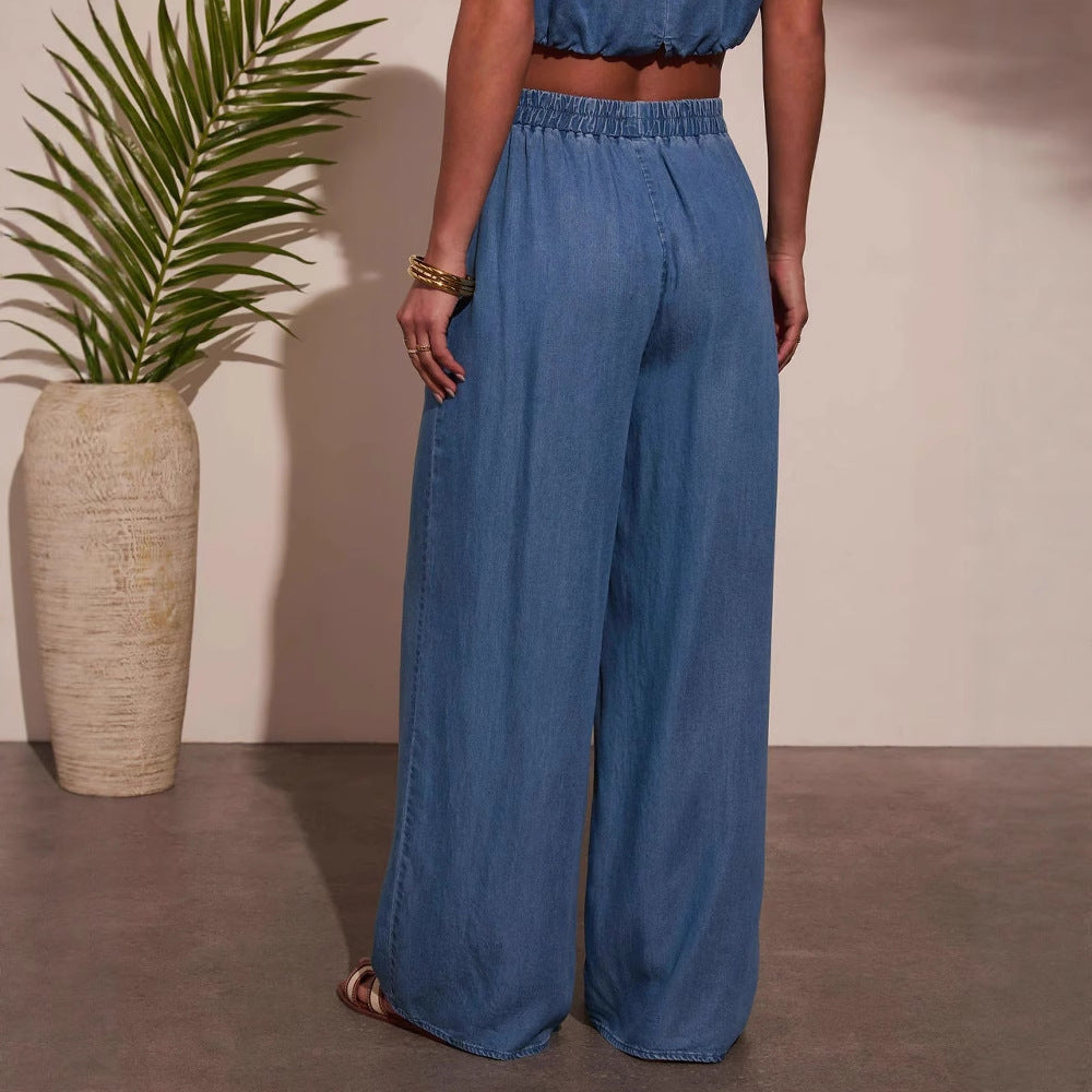 Dette stilfulde og moderne dames denim sæt kombinerer elegance og komfort for et perfekt look til enhver lejlighed. Sættet består af en trendy, kortærmet bluse med elastisk talje og et løst par bukser med bred snit, der smigrer din silhuet.
