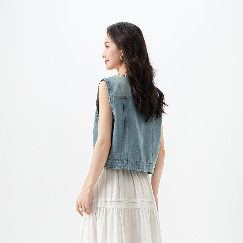 Denim vesten kan bæres både i hverdagen og til særlige lejligheder. Kombiner den med jeans for et afslappet look eller med en nederdel for et modetouch.