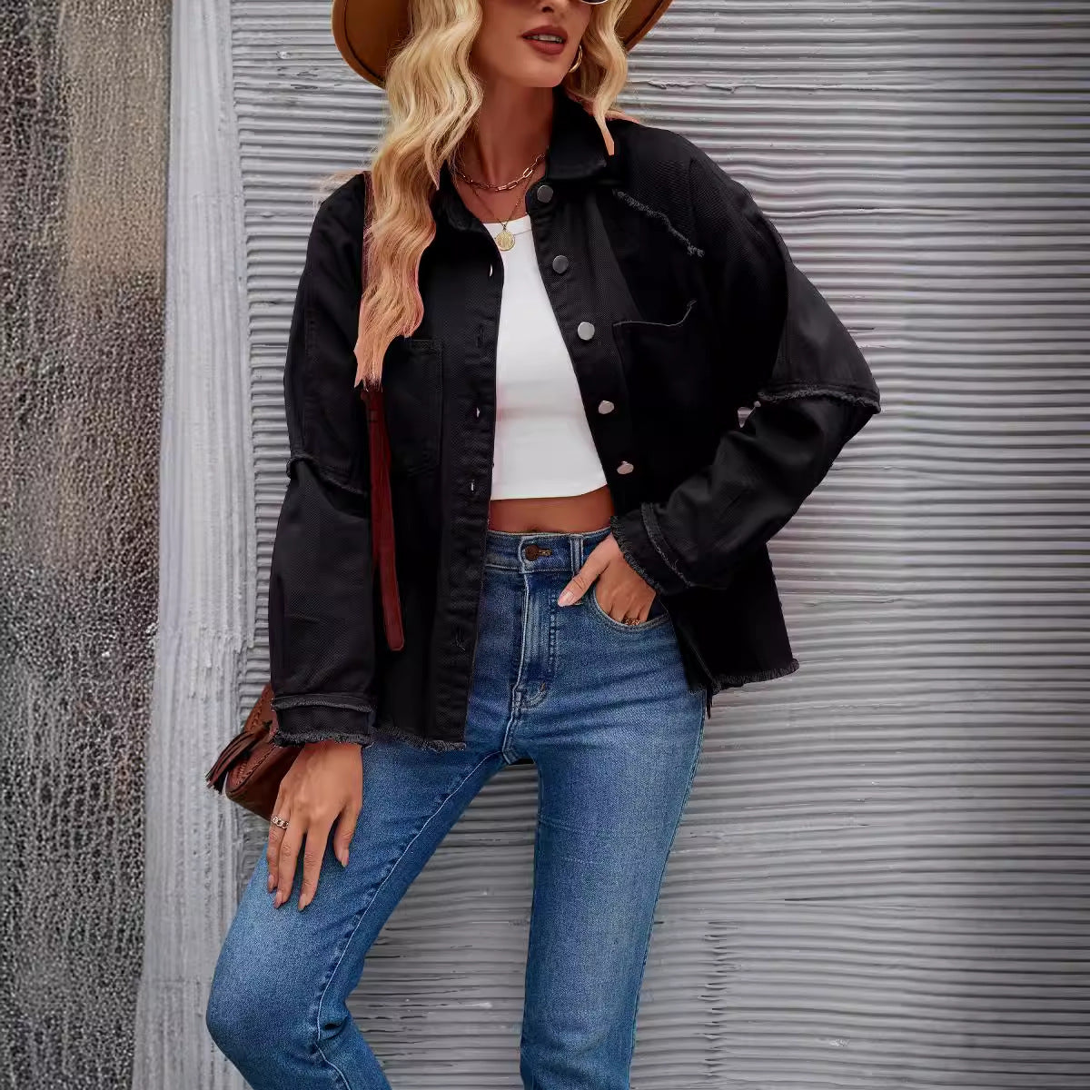 Opdag den nye dame denimjakke fra Stilla, der er perfekt til afslappede outfits og enhver lejlighed. Denne stilfulde jakke kendetegnes ved en trendy, løs pasform og frynsede detaljer ved sømmene, hvilket giver den et moderne og samtidig legende look.