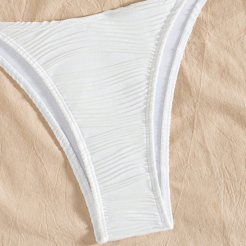 Den nederste bikinidel imponerer med et tidløst design med høje benudskæringer, der visuelt forlanger dine ben. Kombinationen af hvidt stof og sorte accenter giver dette sæt et moderne præg og sikrer, at du skiller dig ud ved enhver strand eller pool.