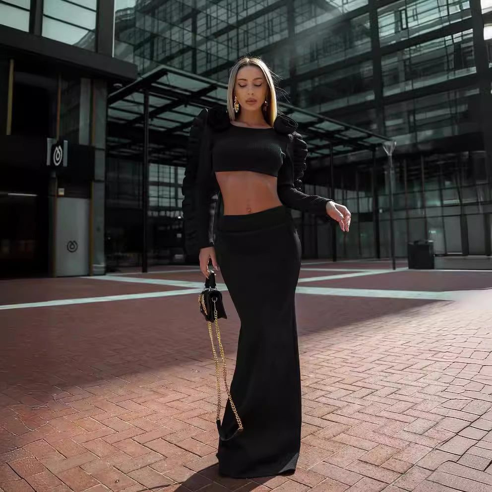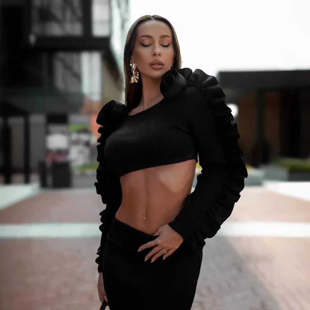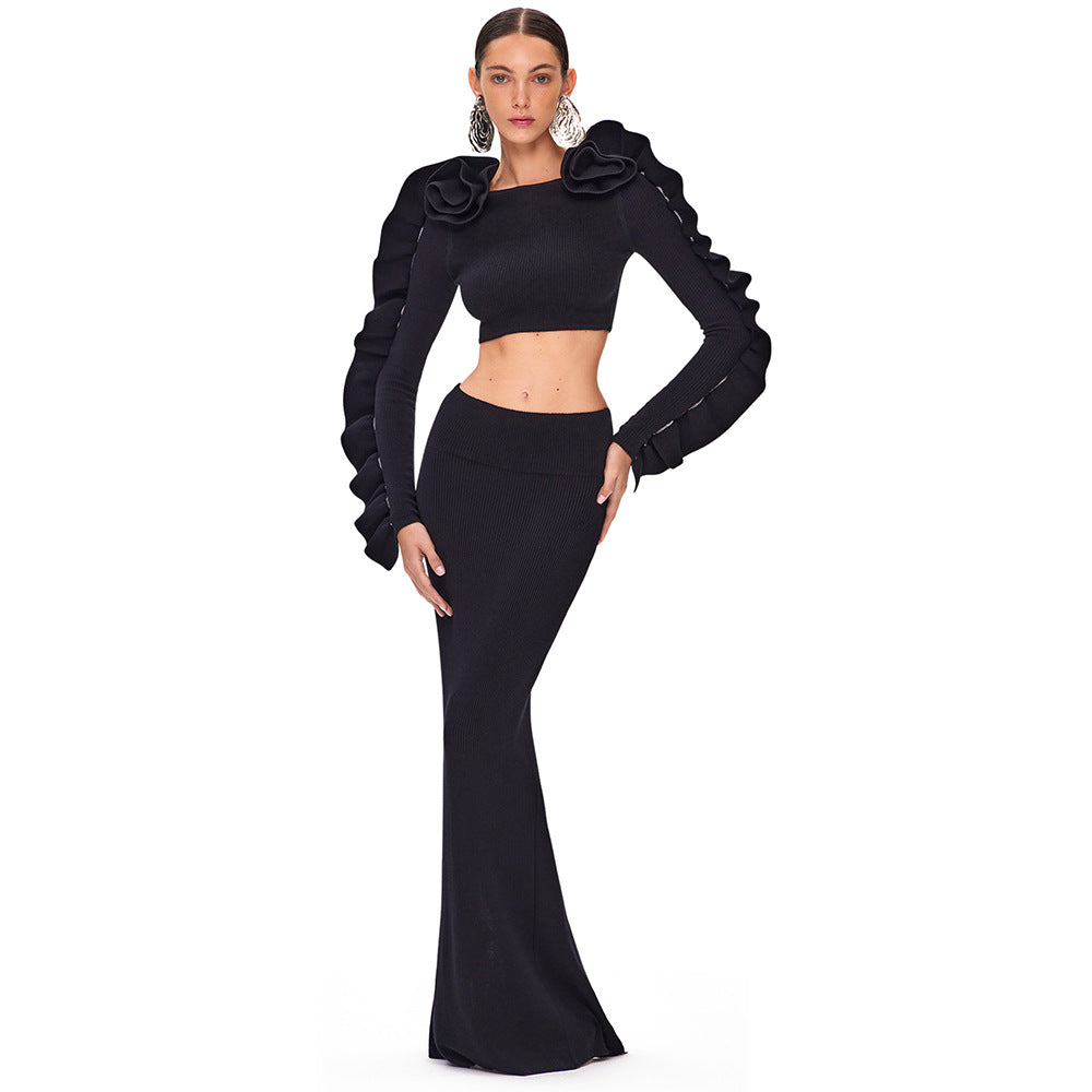 Opdag vores eksklusive damedesigner tøj sæt fra Stilla, designet til stilfulde kvinder, der værdsætter elegance og stil i deres garderobe. Dette sæt består af en kortere top med iøjnefaldende flæsedetaljer på ærmerne og et langt, figursyet nederdel, der skaber en perfekt silhuet.