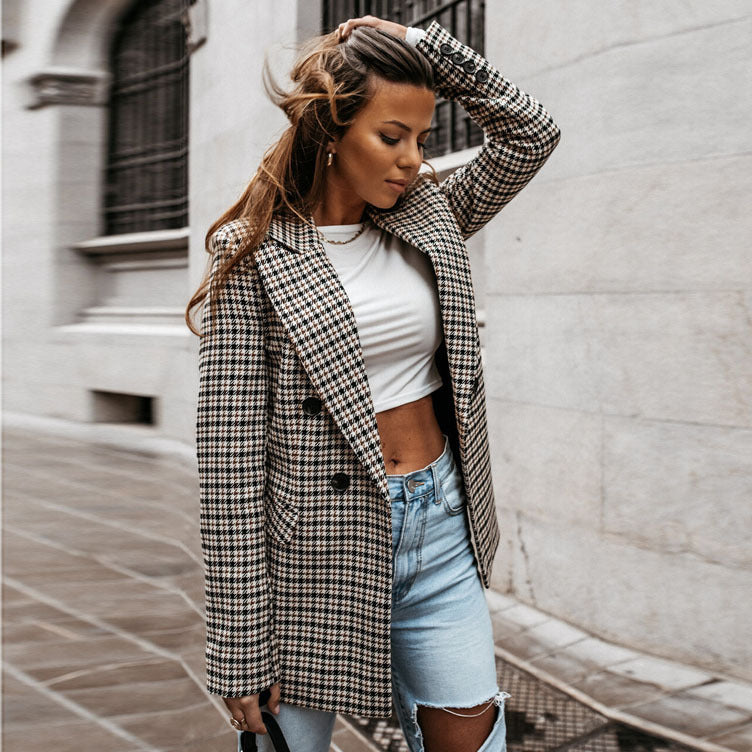 Kombiner blazeren med et klassisk par bukser eller en matchende nederdel for et helt elegant look. Damen dobbelt blazer i ternet mønster er det ideelle udtryk for din individuelle stil.