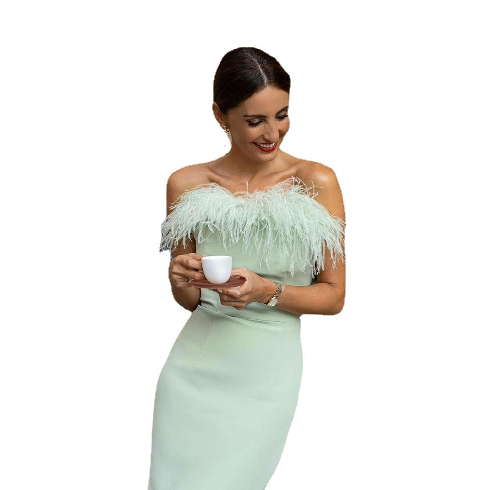 Tilføj et strejf af elegance til dit aftenlook med denne udsøgte aftenkjole fra Stilla. Det skulderfri design fremhæver skuldrene, og det fjerprydede top giver et glamorøst udseende.