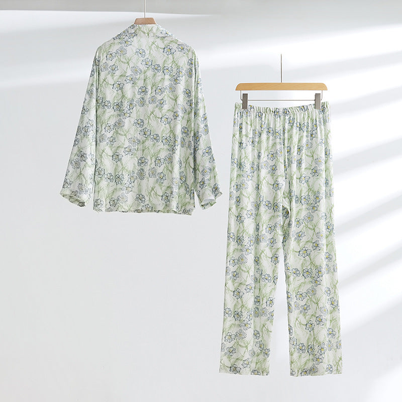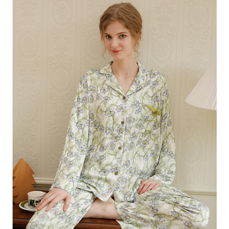 Sættet består af en lang natbluse med gennemgående knaplukning og en skjortekrave, samt et tætsiddende, komfortabelt bukse. De sarte blomster mønstre tilføjer et friskt og feminint præg, hvilket gør dette sæt ideelt til afslappede nætter derhjemme.