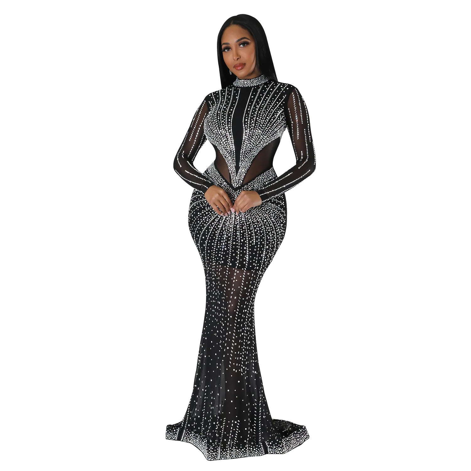 Opdag vores fantastiske, elegante aftenkjole med glitrende rhinestones og transparente indsatser, ideel til særlige lejligheder og glamorøse begivenheder.