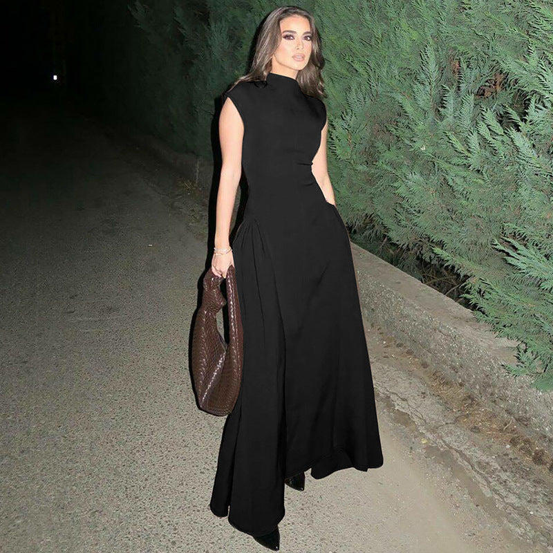 Denne dames aftenkjole forener moderne elegance med tidløs tiltrækning. Kjolen kendetegnes ved sin høje krave og den flydende, strukturerede nederdel, der komplimenterer enhver figur og giver en fantastisk silhuet.