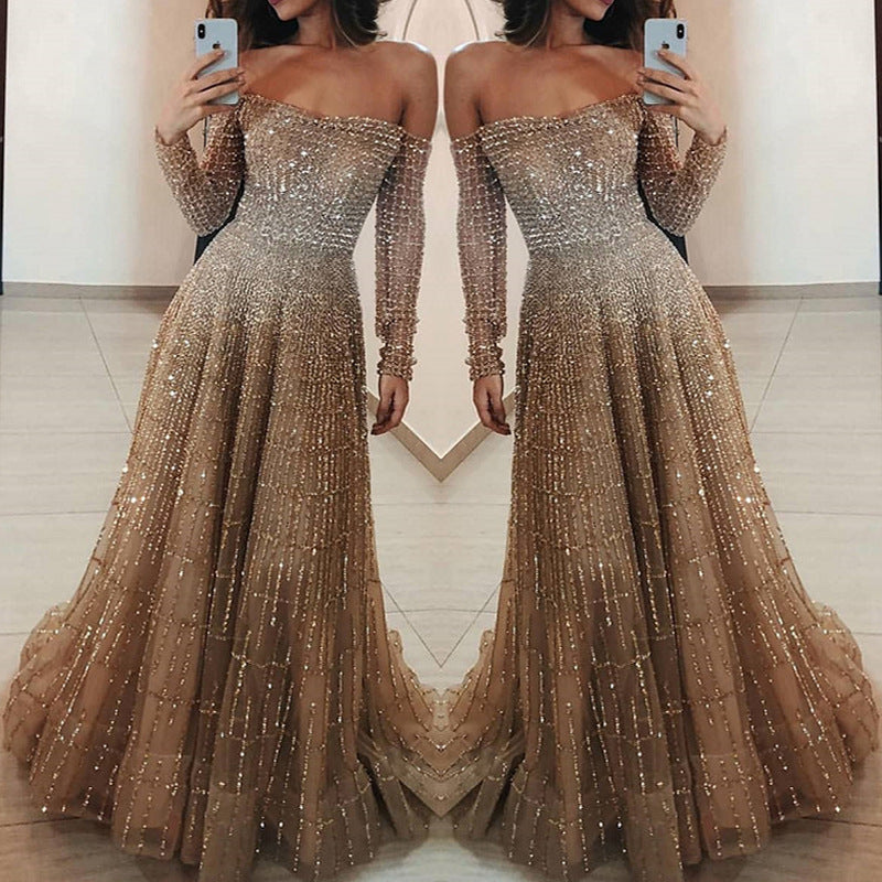 Oplev vores fantastiske elegante aftenkjole, der imponerer med skinnende detaljer og en stroppeløs skæring. Denne kjole forener glamourøs elegance med moderne design og er perfekt til særlige anledninger, bryllupper eller formelle begivenheder.