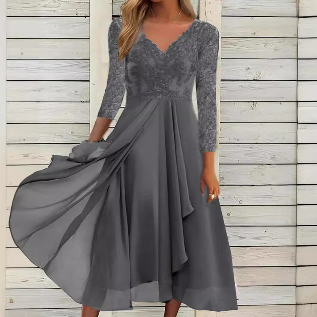 Opdag vores stilfulde aftenkjole, som forener både elegance og komfort. Med en fortryllende spidsetop og en let, flydende nederdel er denne kjole det perfekte valg til festlige anledninger.