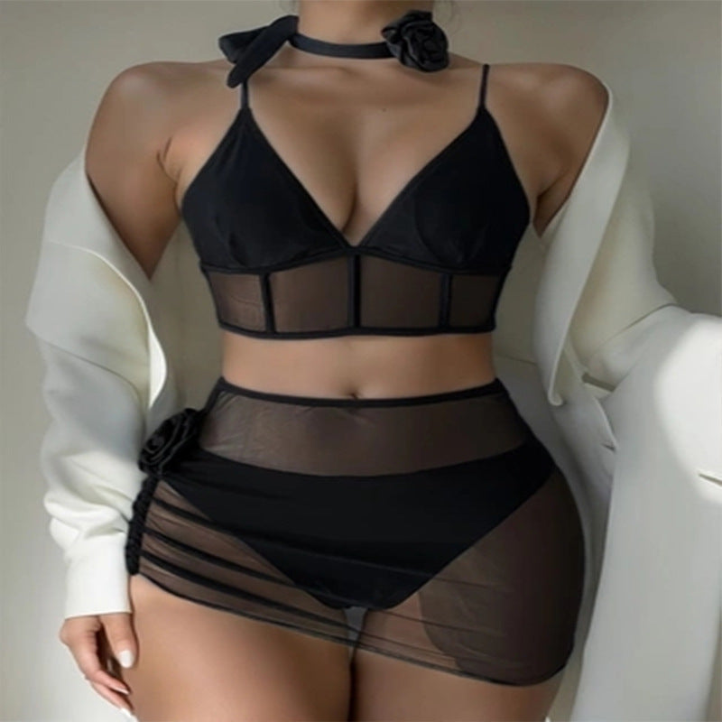 Opdag vores elegante BH-sæt til kvinder, der imponerer med et stilfuldt design og materialer af høj kvalitet. Dette sæt indeholder en gennemsigtig tyl-BH, der sætter smukke accenter og omfavner kroppen, samt en matchende underdel, der tilføjer et strejf af raffinement. Chokeret med en delikat blomst fuldender det samlede look og giver dig et særligt udseende.