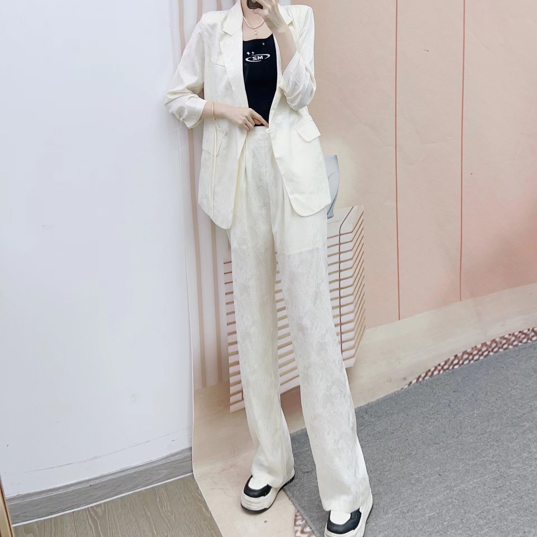 Opdag Stilla' damask elegante blazer-bukser sæt i minimalistisk design med subtile florale detaljer – det ideelle valg for stilbevidste kvinder, der søger elegance og komfort.