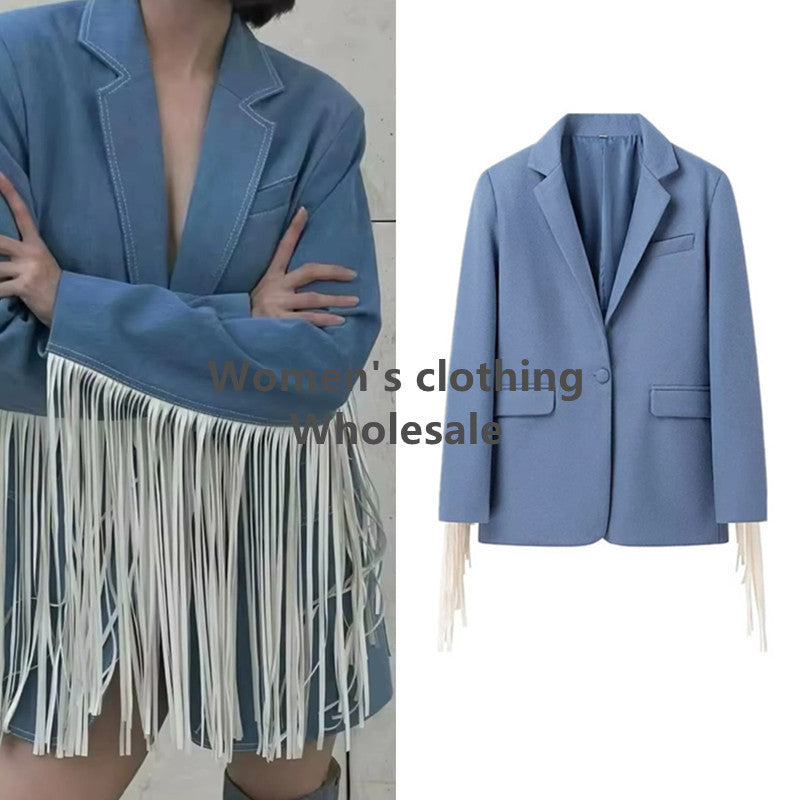 Opdag den perfekte kombination af stil og komfort med denne dames blazerjakke. Denne elegante jakke er ideel til formelle anledninger samt til daglig brug. Dens unikke frynsede detaljer giver det klassiske design et moderne præg.