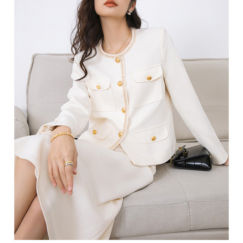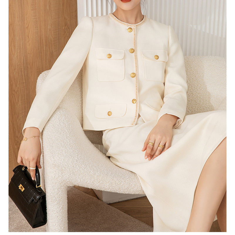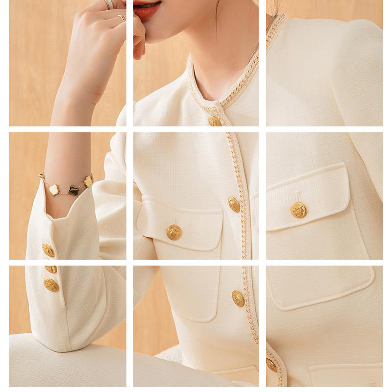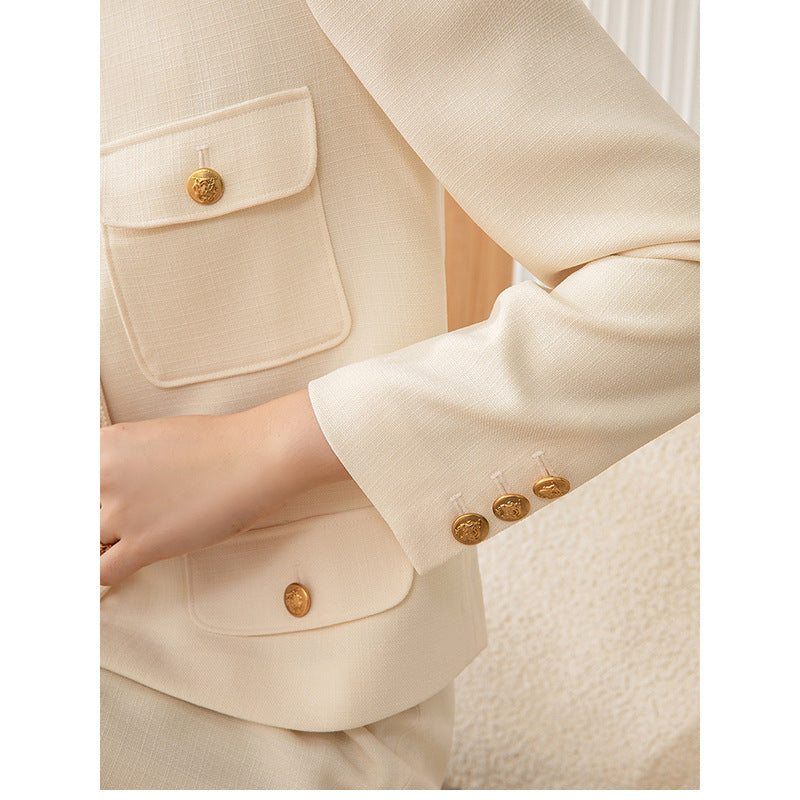 Opdag vores dames elegante blazerjakke med struktureret stof og gyldne knapper, der giver ethvert garderobe et strejf af raffineret stil.