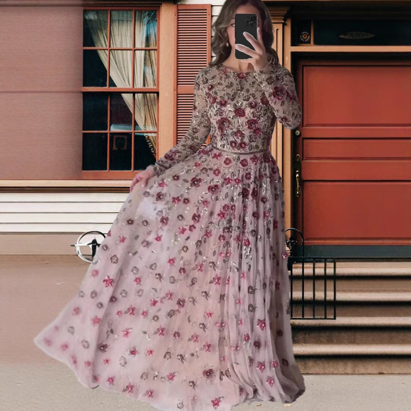 Opdag den udsøgte Damen Elegante Blomsterkjole, som er den perfekte kjole til særlige anledninger. Denne kjole imponerer med sine fine blomsterbroderier og en lang, flydende tylskørt, der forener bevægelse og elegance.