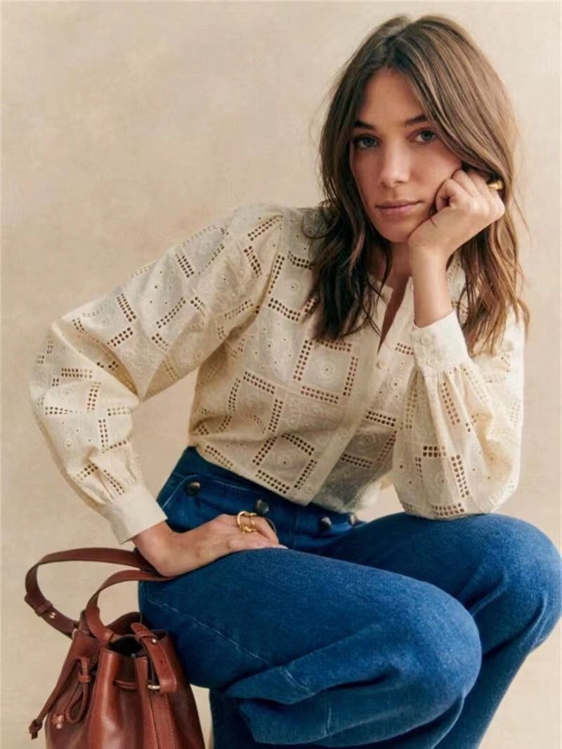 Opdag vores stilfulde damerbluse, der imponerer med sit fine hulbroderi-design. Denne eksklusive bluse forener elegance med moderne flair og er ideel til enhver lejlighed, hvad enten det er på kontoret eller til en middag.