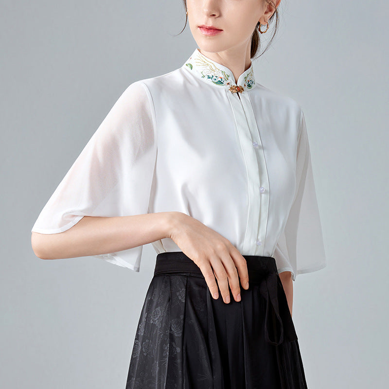 Denne eksklusive dameskjorte fra Stilla kombinerer tidløs elegance med moderne design. Blusen imponerer med sin transparente ærmesnit og de kunstneriske, florale broderier ved kraven.